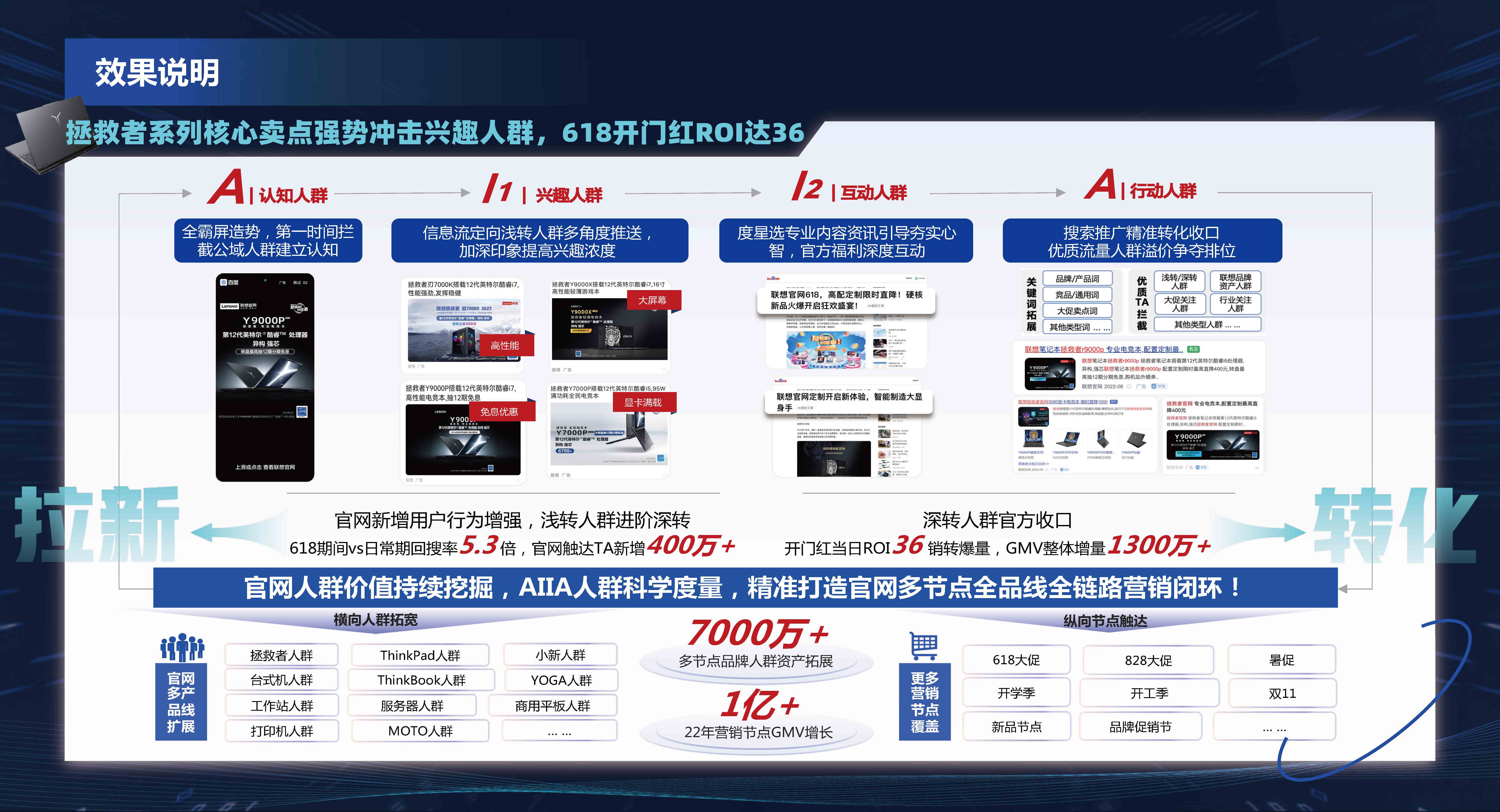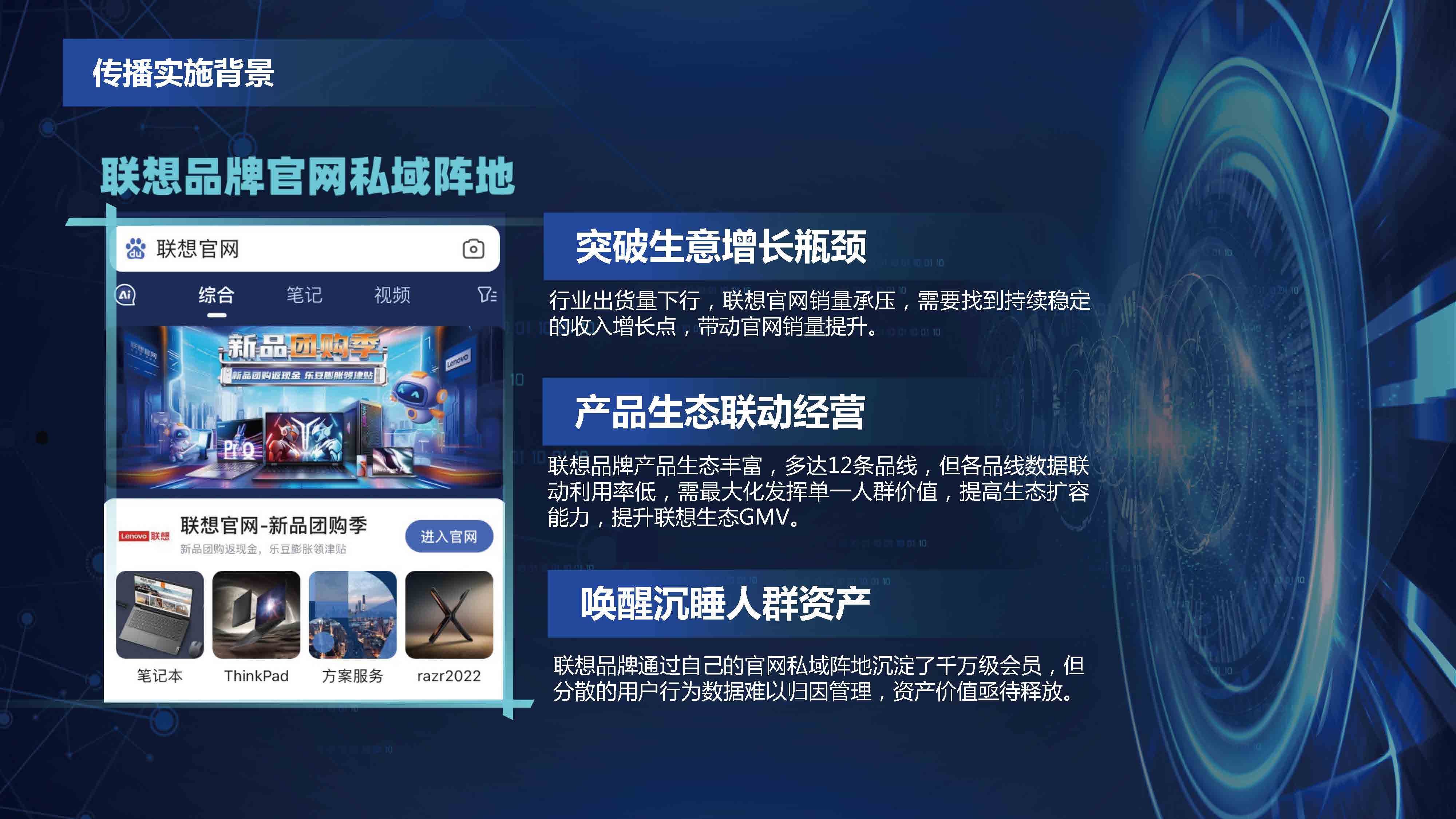 行业出货量下行,联想官网销量承压,需要找到持续稳定的收入增长点,带动官网销量提升。联想品牌产品生态丰富,多达12条品线,但各品线数据联动利用率低,需最大化发挥单一人群价值,提高生态扩容能力,提升联想生态GMV。