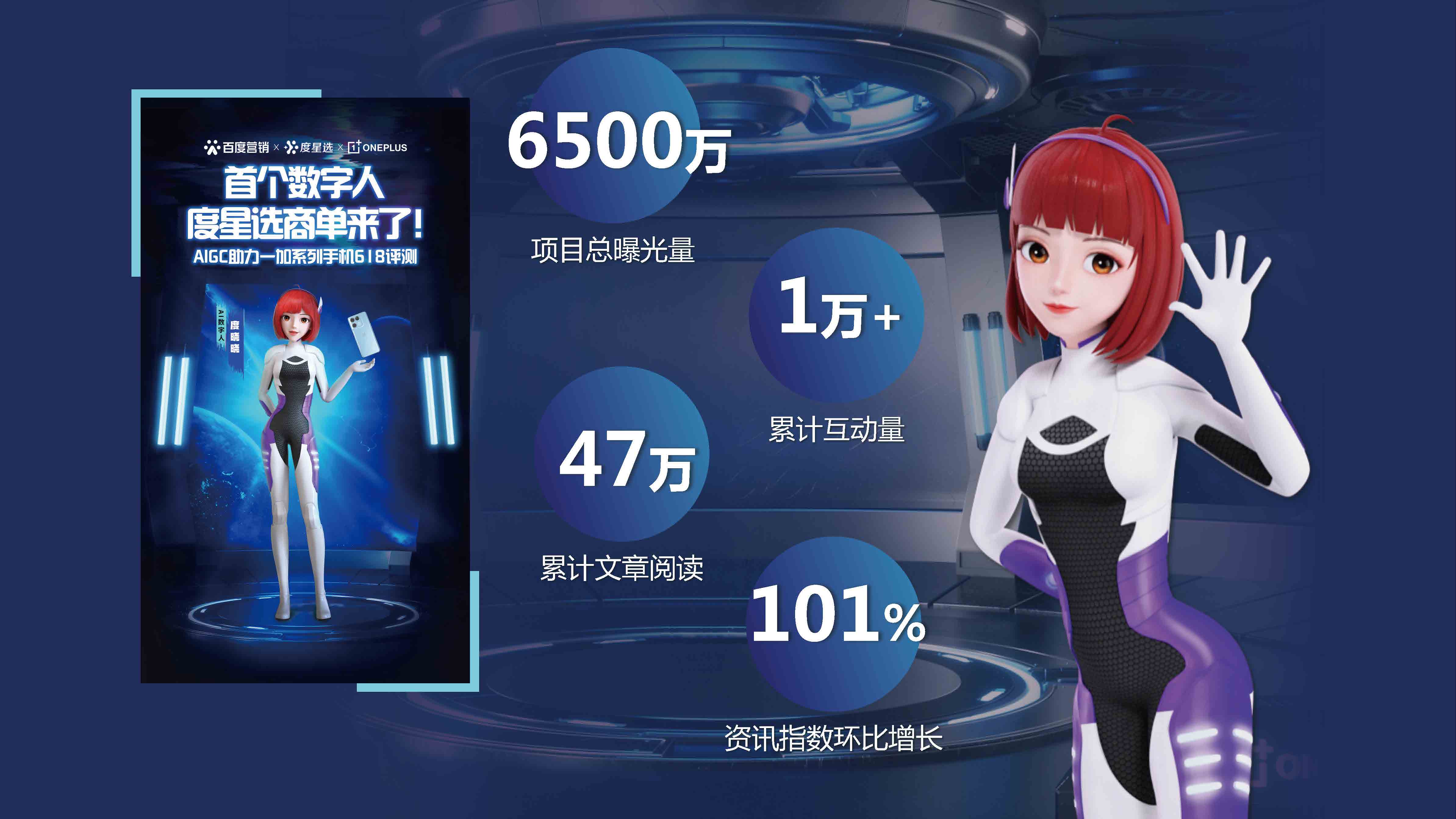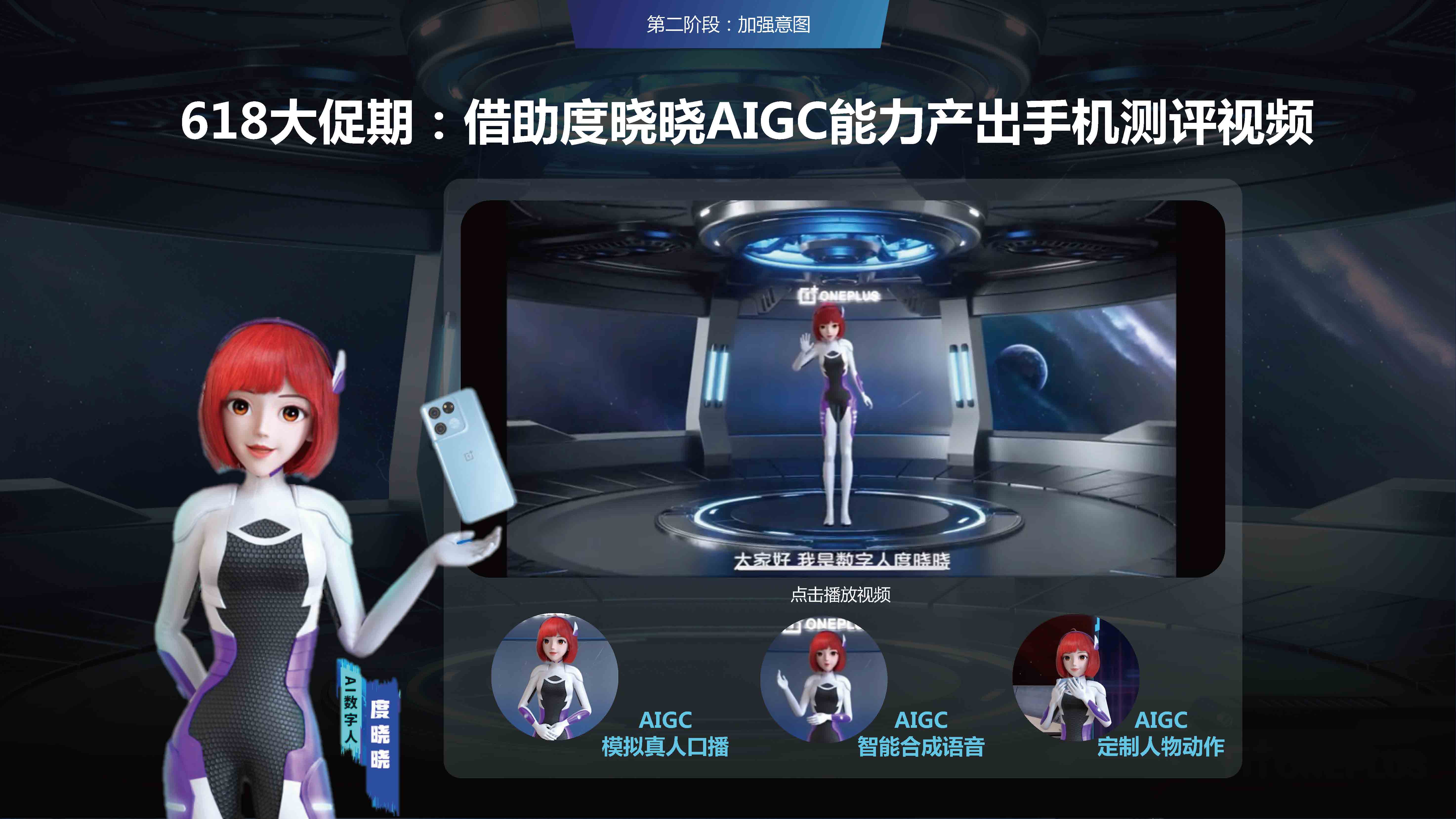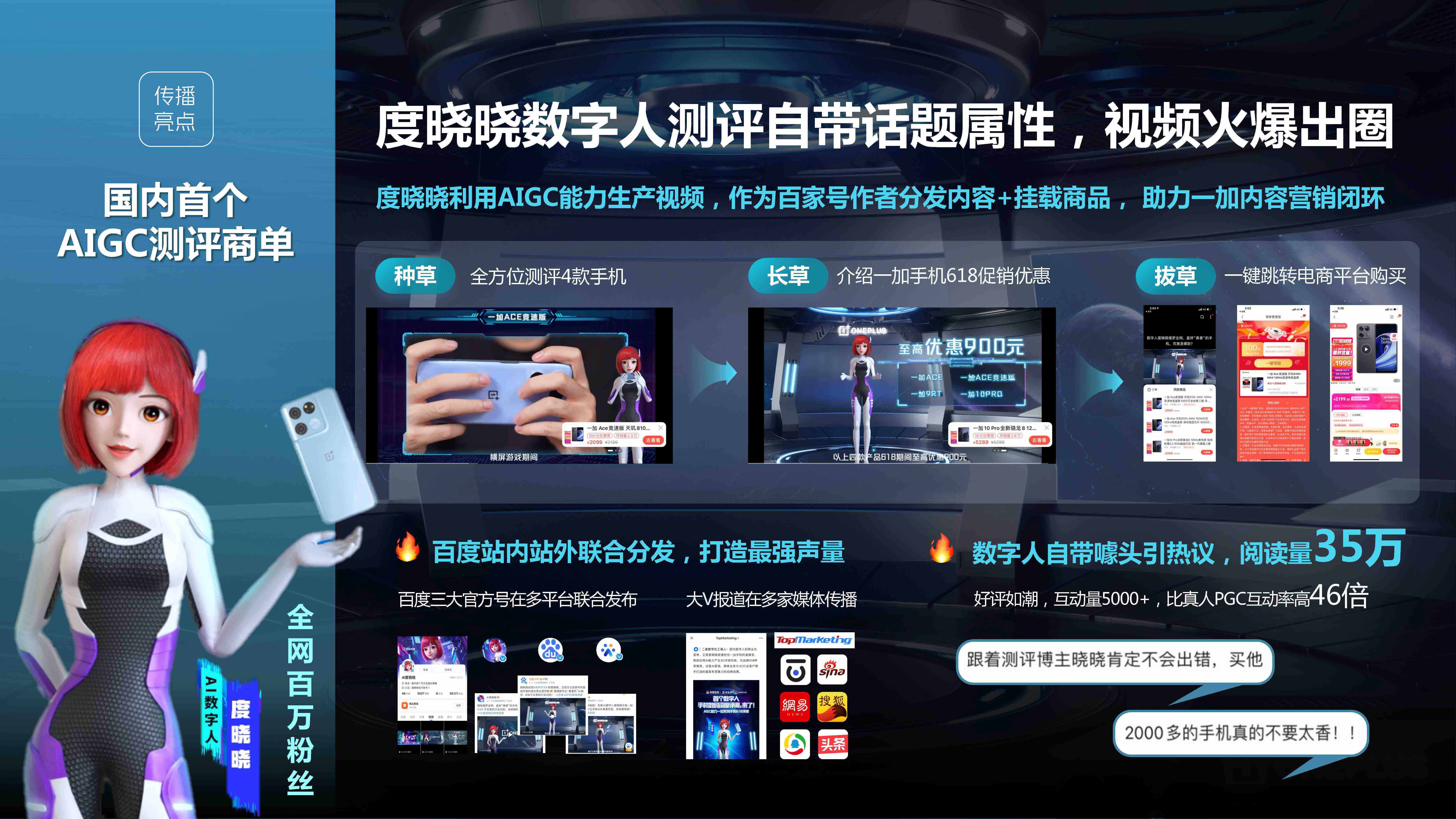 数字人度晓晓AIGC能力生产评测视频助力一加618种草,打开了web3.0时代全新内容营销方式,首创百度特有AIGC内容营销玩法。