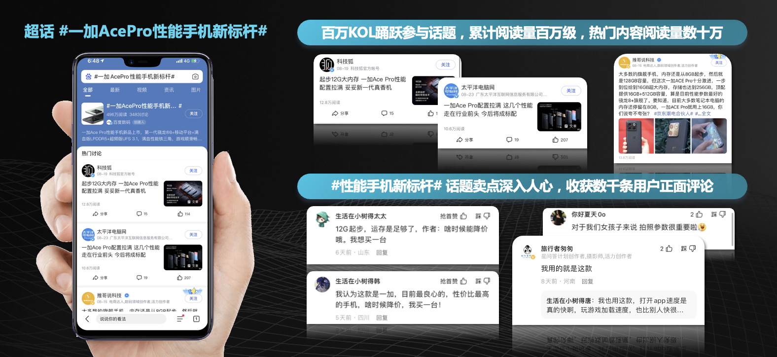 认知:新品上市期通过话题营销广泛传播性能新标杆的品牌形象,话题快速扩大Ace系列新机的品牌认知度
