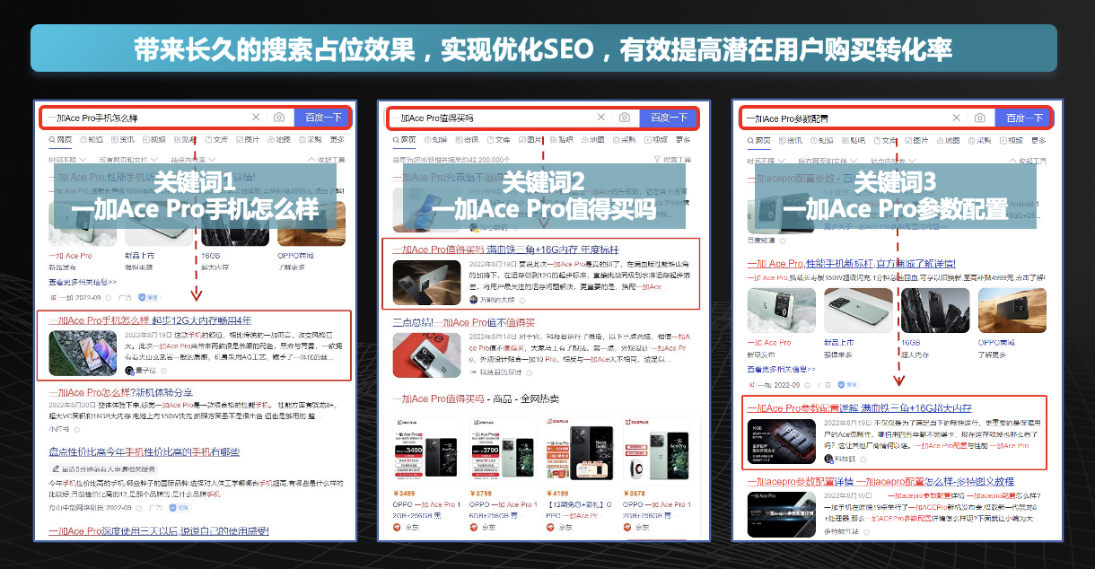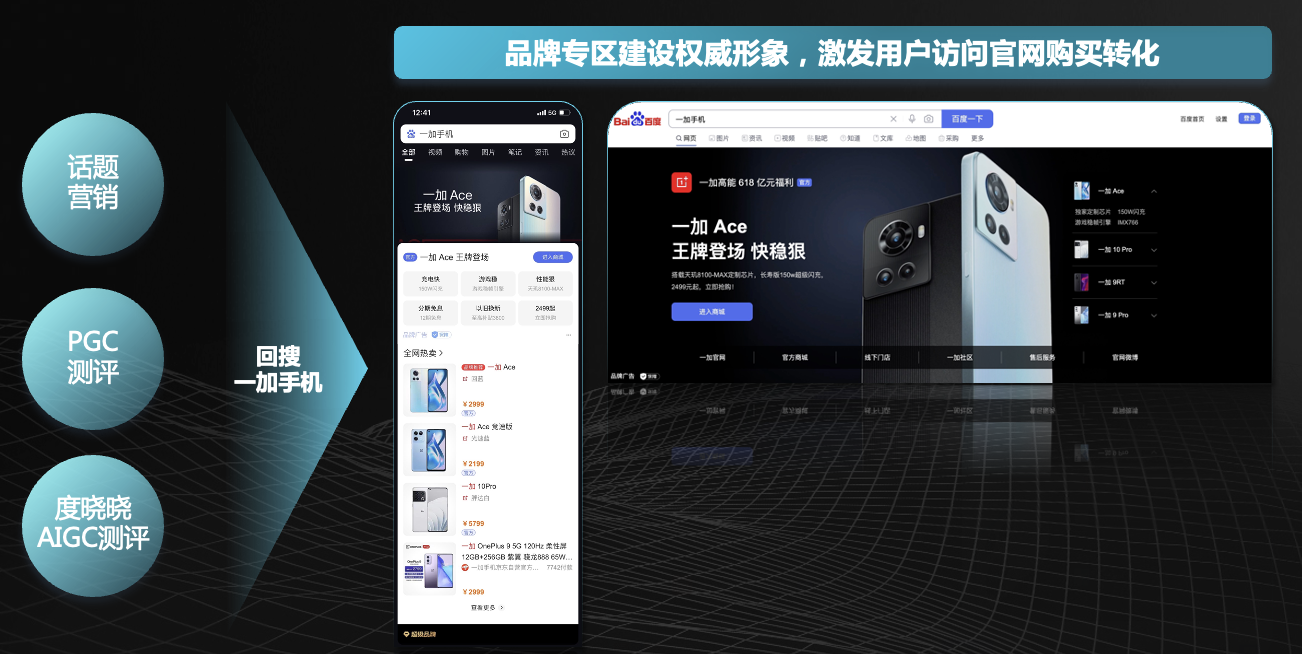 行动:当用户搜索一加Ace相关信息时,高优展现百家号口碑内容引导舆情,品牌专区建设权威形象引导访问官网实现购买闭环
