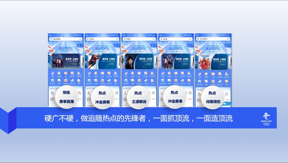 咪咕视频对体育布局已久,从2018俄罗斯世界杯开始便在体育领域持续发力,打造竞争力,这几年已跻身行业第一梯队,此次拿下东京奥运会+北京冬奥会的直播版权则更加巩固其地位,咪咕视频几乎包揽了2021年-2023年体育大年的所有顶流赛事。如何在垂直赛道上进一步扩大市场则是咪咕视频的重要课题,对于百度的投放合作,不仅仅要做到完成竞品拦截、本品保障、核心人群引导转化的任务,还要通过流量媒体的运营实现品牌在奥运期间的破圈传播。
