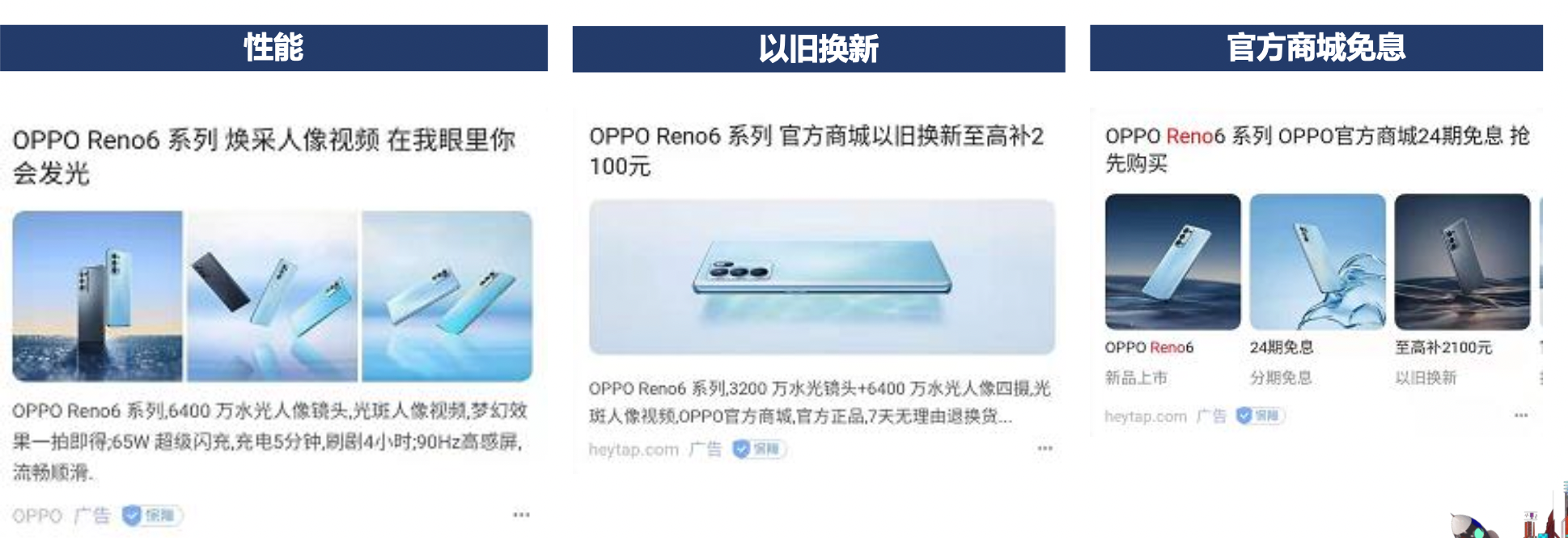 在这场新机发布营销的后链路打通中,AI洞察持续发力。围绕发布主题"夏日晴海",定制代言人周冬雨的海报和视频,夏日气息呼之欲出,一句代言Slogan"在我眼里你会发光"撩拨人心,精准捕捉周冬雨粉丝人群,激发情绪价值,进一步抢占目标用户心智。还通过更有创意的开屏和搜索框联动,吸引用户主动完成品牌检索,刺激用户强效转化;针对搜索场景灵活输出Reno6卖点、购机政策等;针对资讯场景实施追投检索人群,促进购买转化。