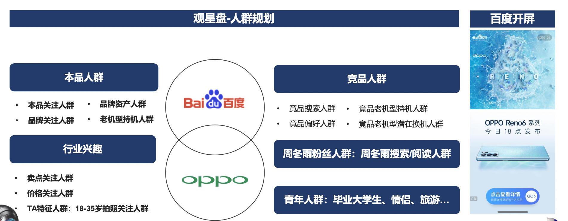 基于百度观星盘——AI智能人群触达,从搜索行为、阅读偏好、网页浏览、设备属性等维度,OPPO精准圈定目标受众。这背后品牌数字资产+智能定向能力成为重要技术基础。除去常规手机产品相关热词,任何一个与Reno6之间具有专属联系的要素都有可能带来真正具价值的用户。如Reno6的亮点设计理念为焕采人像视频,对人像、视频、人像视频高敏感的人群都有可能对Reno6更感兴趣。而百度端具有海量的搜索数据、知识数据和资讯数据……强大的AI计算和判断能力,能更精准找到对人像、视频、人像视频高敏感的人群,提高平台数据与品牌需求的匹配度,使得与用户的精准链接成为可能。