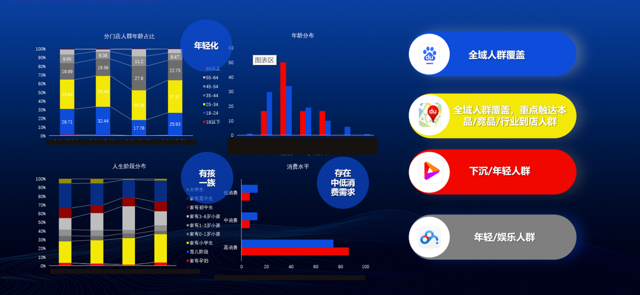 资源智取这块涉及2方面:一个是通过人群分析,提供客户更丰富的开屏投放资源组合,比如到店人群存在部分低消费需求的下沉人群,推动好看视频开屏资源选择。另一块是百度地图资源,今年针对本地化客户有了很多创新资源,定向本地用户投放重点攻打。