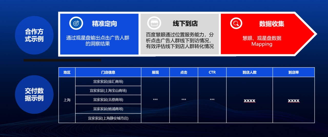 最终,利用百度大数据进行营销数据验证。通过观星盘输出广告人群数据洞察结果,慧眼通过位置服务能力,分析点击广告人群线下到访情况,有效评估线下到店人群转化情况,将两部分数据mapping出来实际的到店人数数据计算到店率,进行效果验证及下一步优化。