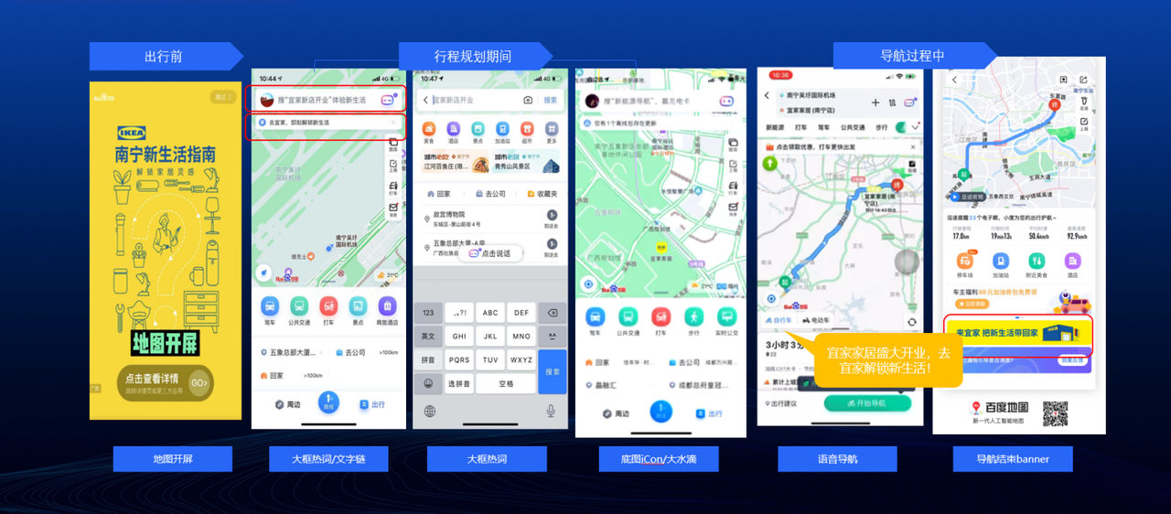 本次宜家南宁新店开业,首次尝试南宁本地默认语音导航植入宜家新店开业语音播报,配合本地地图开屏、首页大框热词、底图iCon、大水滴、导航结束页banner等,在用户出行前、行程规划过程中、及导航期间,最大程度宣传新店,激发用户到店需求,更便捷的引导用户到店。