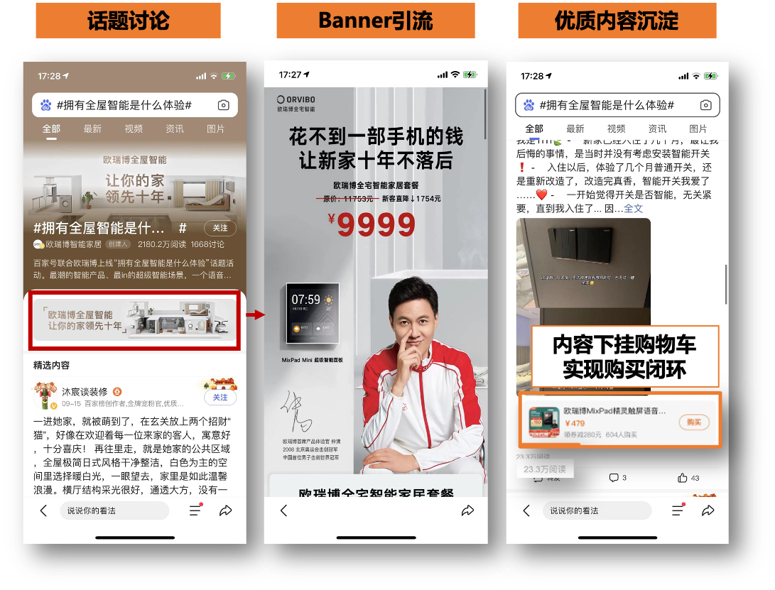 1、通过打造话题【拥有全屋智能是什么体验】,邀请达人参与,从产品体验、科技实力、案例分享多角度解读欧瑞博产品。并通过话题内转化组件,实现购买闭环。