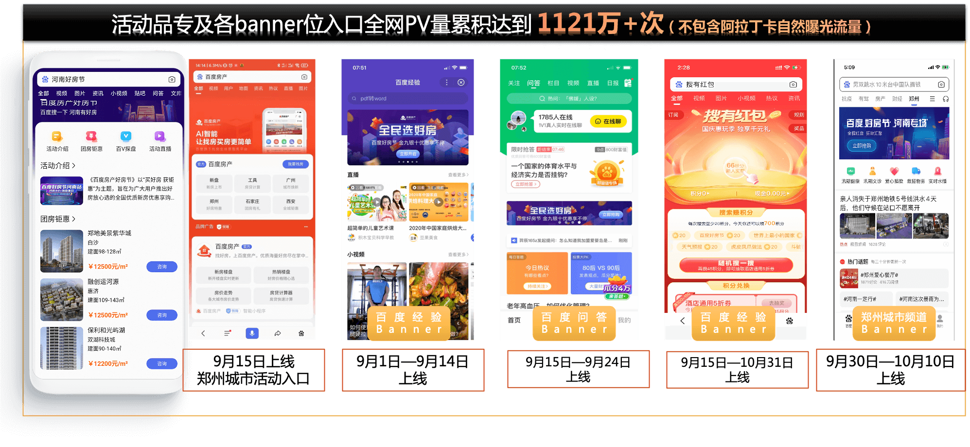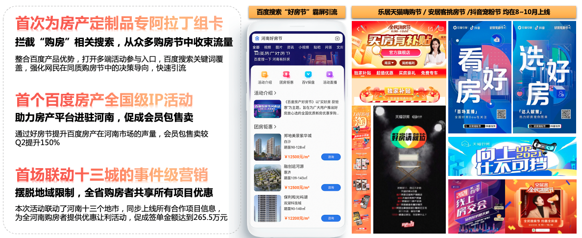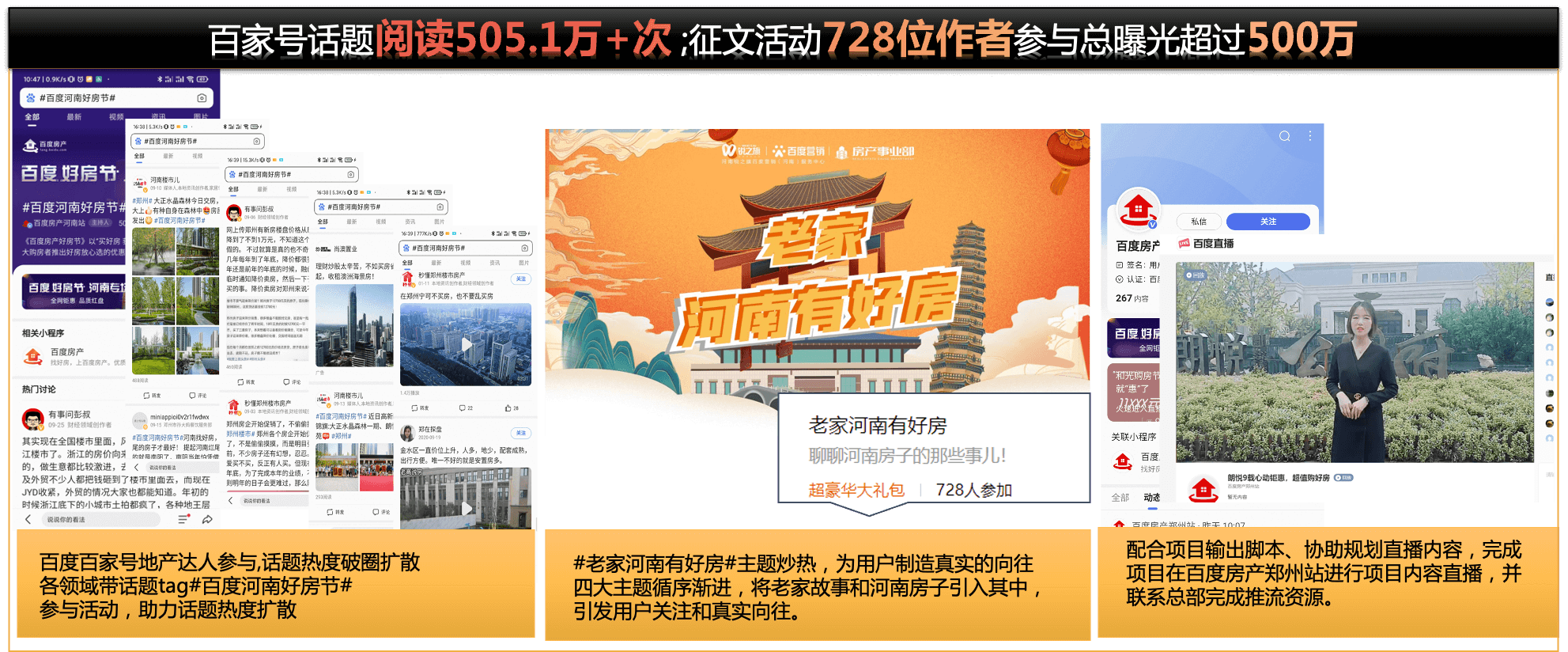 『百度河南好房节』整体活动从2021年9月6日上线至2021年10月31日落下帷幕, 实现多媒体全维度2.7亿+媒体曝光量,合作客户27家,1600万+百度&微博社交媒体定制话题传播阅读量,粉丝覆盖量超397万。此次活动强势破圈,引爆市场,可谓做出了面向新趋势的教科书级别案例,实现品牌&城市现象级传播,更以内容营销+创意表现的形式清晰化展示地产项目,百度房产在发展中不断创新,志做房产线上化营销的“推动者”。