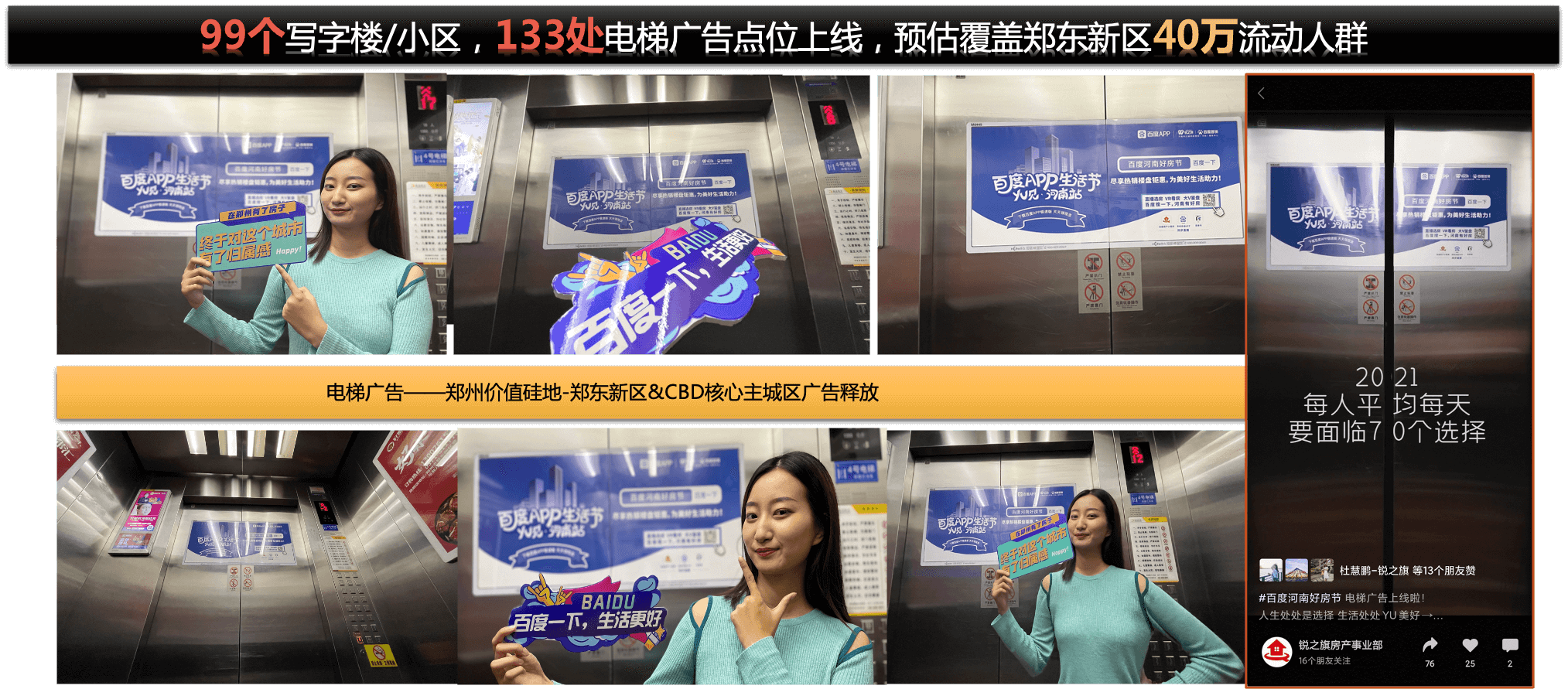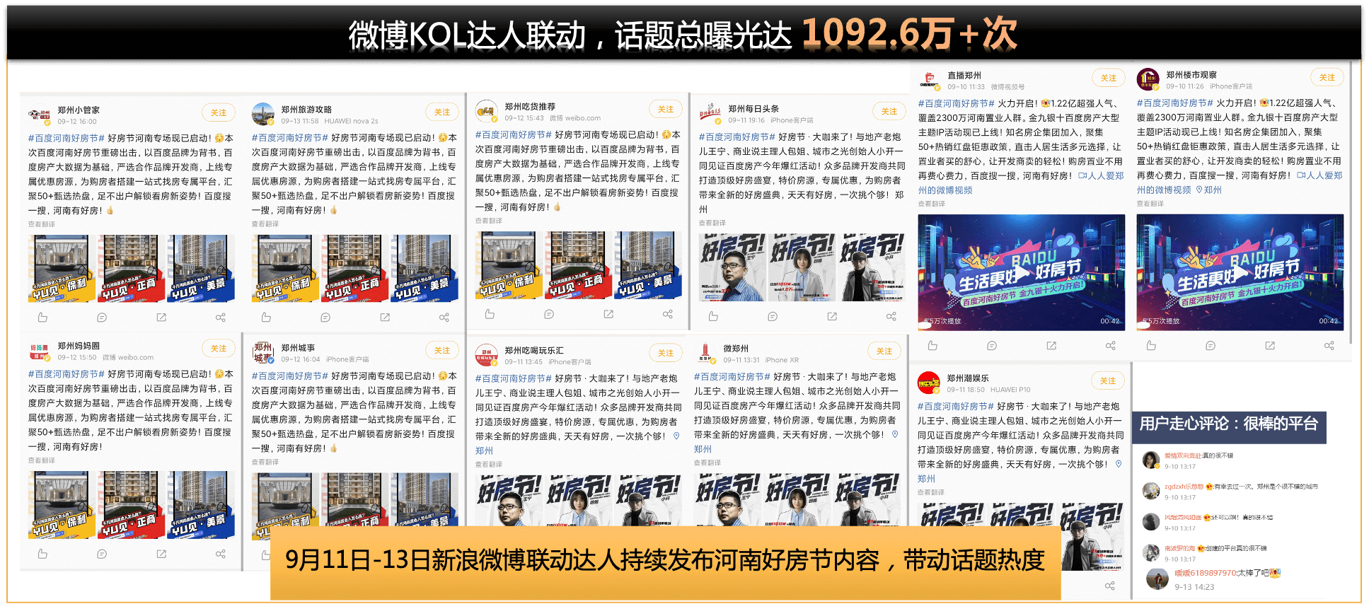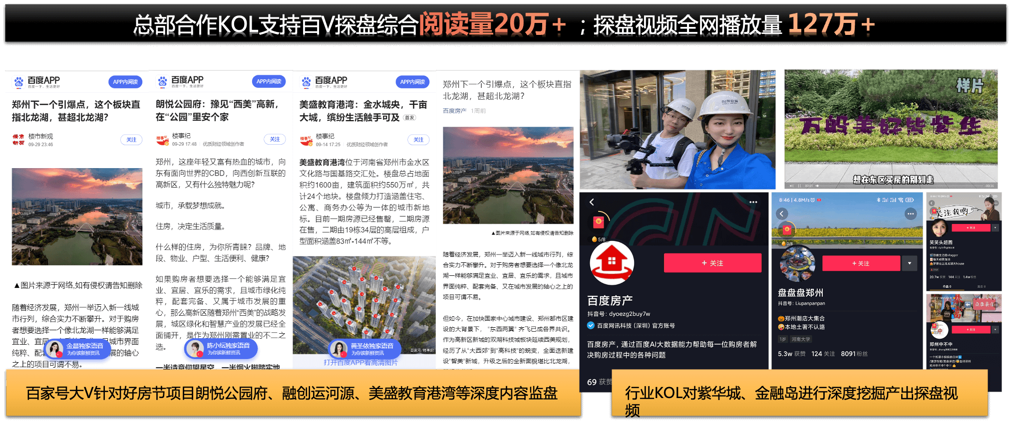 『百度河南好房节』整体活动从2021年9月6日上线至2021年10月31日落下帷幕, 实现多媒体全维度2.7亿+媒体曝光量,合作客户27家,1600万+百度&微博社交媒体定制话题传播阅读量,粉丝覆盖量超397万。此次活动强势破圈,引爆市场,可谓做出了面向新趋势的教科书级别案例,实现品牌&城市现象级传播,更以内容营销+创意表现的形式清晰化展示地产项目,百度房产在发展中不断创新,志做房产线上化营销的“推动者”。