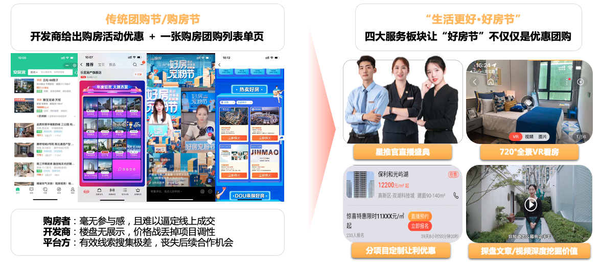 创新二:四大板块服务加持,更多玩法形式赋能,从一场普通的购房“团购”升级为全链路购房盛典。