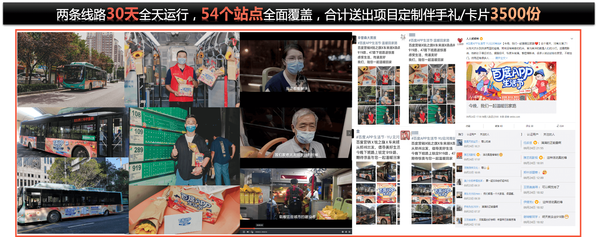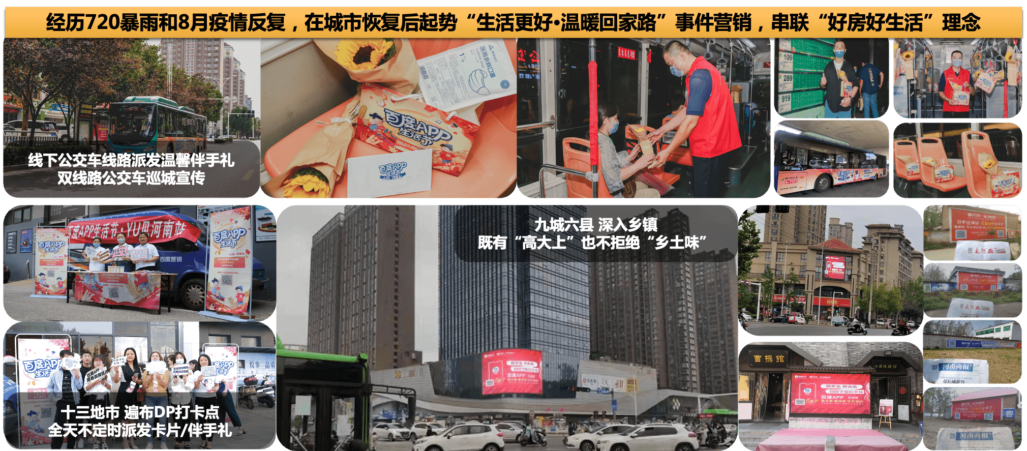 与百度APP生活节进行深度融合,结合疫情交通恢复后的特殊节点,打造“温暖回家路”事件营销活动,辐射十三地市九城六县,通过各类线下互动触达C端生活,传递好房好生活的理念,为活动持续发声提供声量支撑。