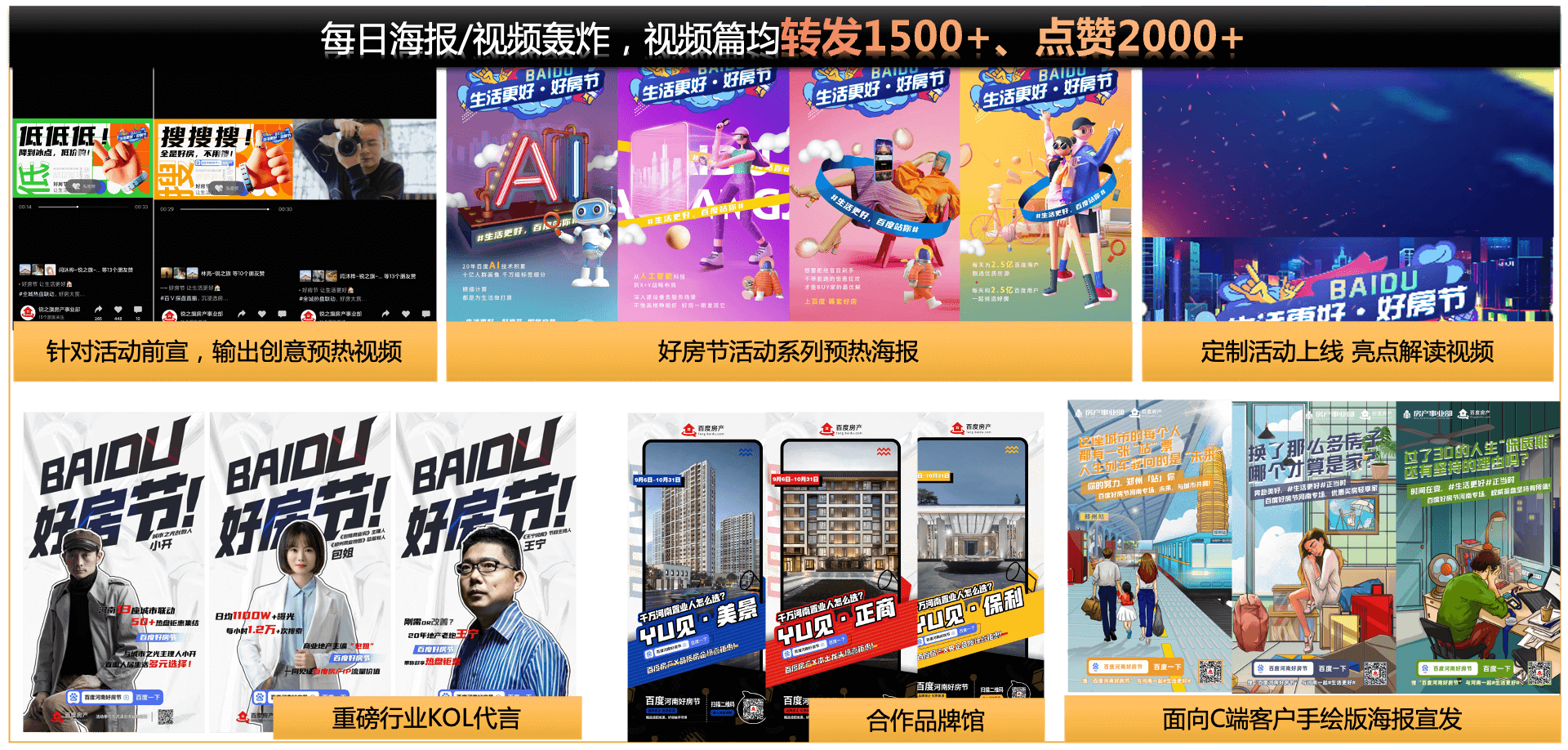 结合“好房节”四大特色板块,对合作项目的亮点、价值点、宣传点进行新一轮的深耕,让B端可以全面展示自己产品价值、让C端可以全面参与购房全链路,提升线索有效性,配合百度系效果类产品投放,进一步圈定精准高意向客户。