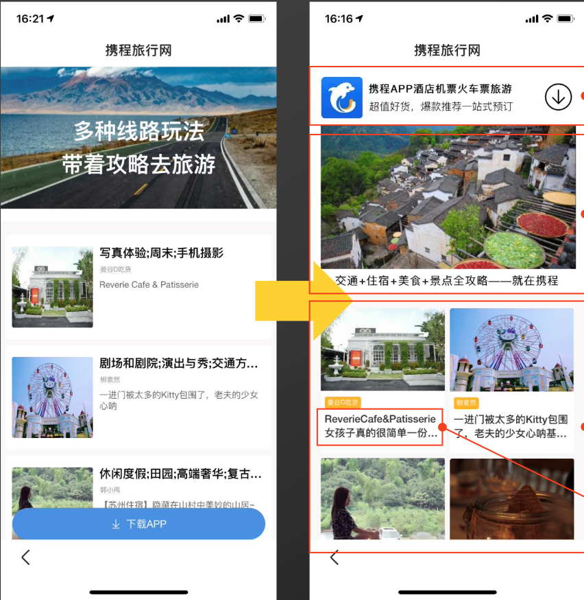 2020年,旅游行业受疫情打击严重,用户即时下单需求减少,预售、囤货、未来消费成为新趋势,相比单次转化,广告主更加关注用户生命周期,将新客沉淀到APP中、积累长期收益,成为携程的新需求,现有落地页,投放使用固定中间页,用户体验差,且会因落地页相关性较差,导致展现受限,效果并不理想。