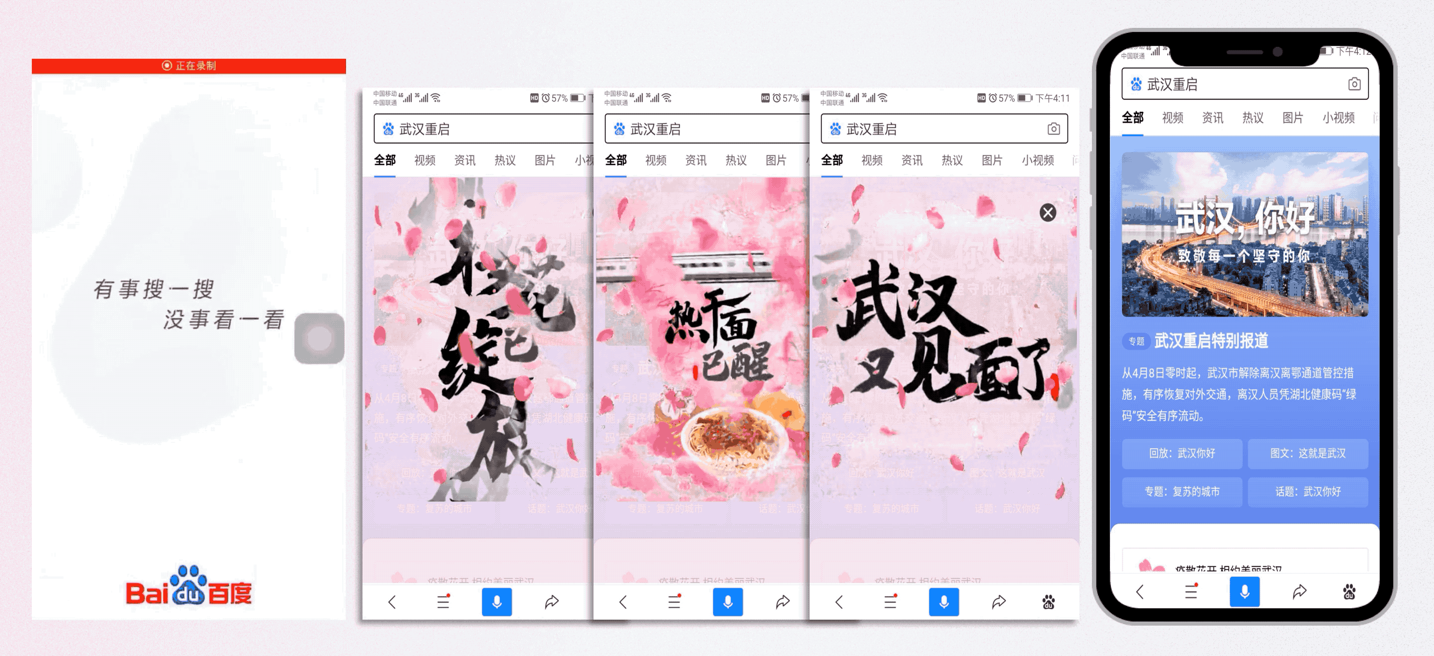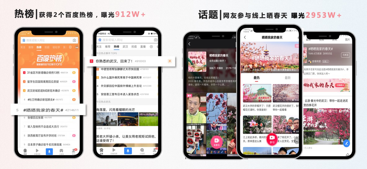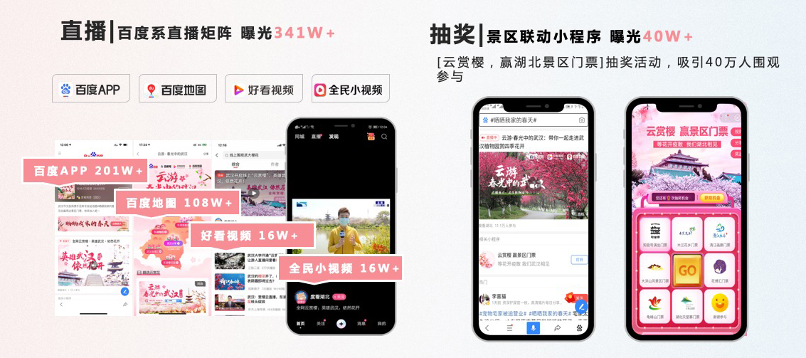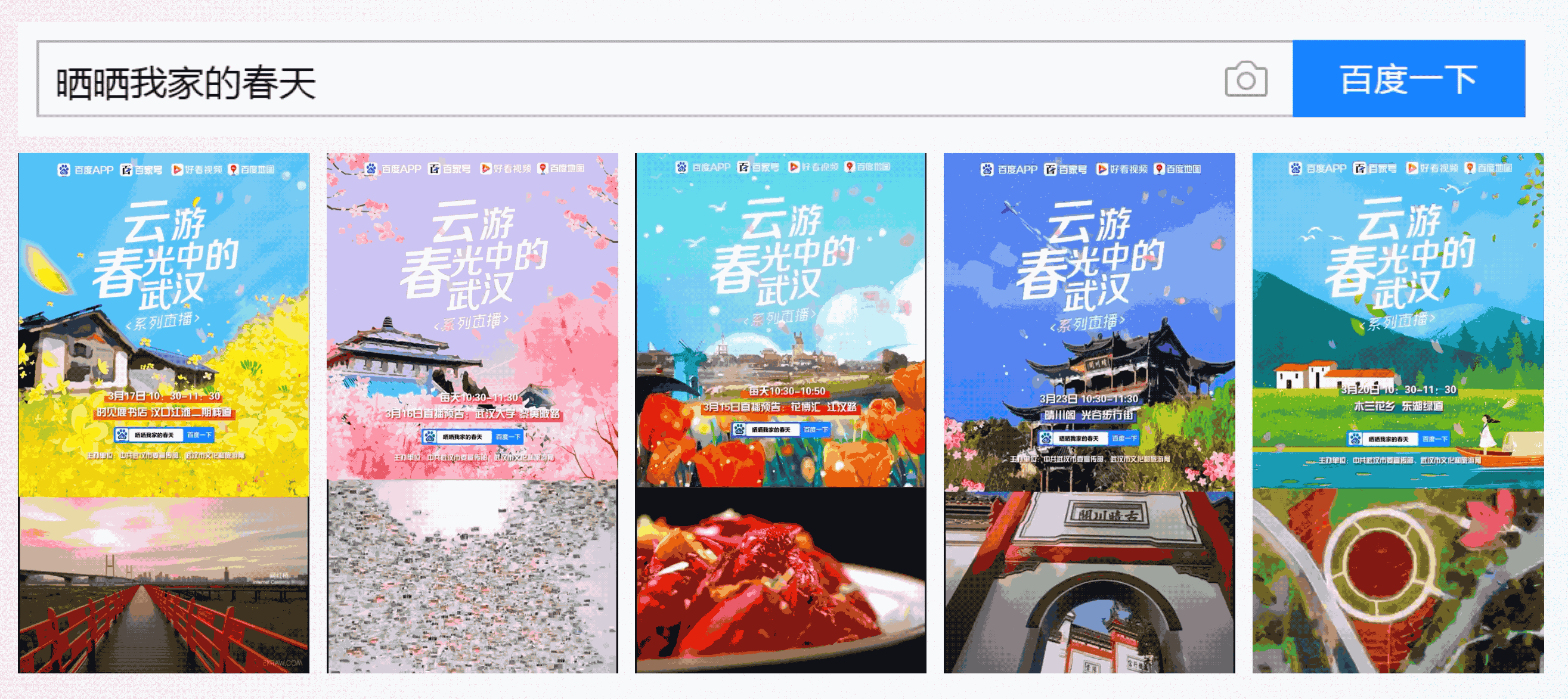 充分发挥百度信息平台优势,联动多平台、明星等资源,合力打造武汉云上樱花节,让网友身临其境感受“樱花之城”全景盛况,展现武汉城市魅力;同时通过定制搜索彩蛋、互动小程序、互动话题,和全国网友边看边玩边聊,拉近城市距离,提升武汉城市好感度。