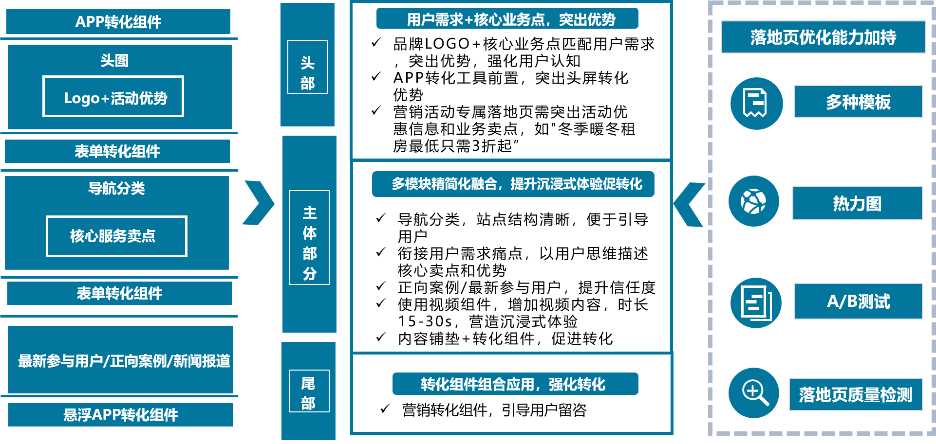 (2)落地页优化策略:落地页头部、主体以及尾部需突出不同重点以突出优势促转化,同时落地页内容板块设置,需跟进关键词和创意保持相关性。