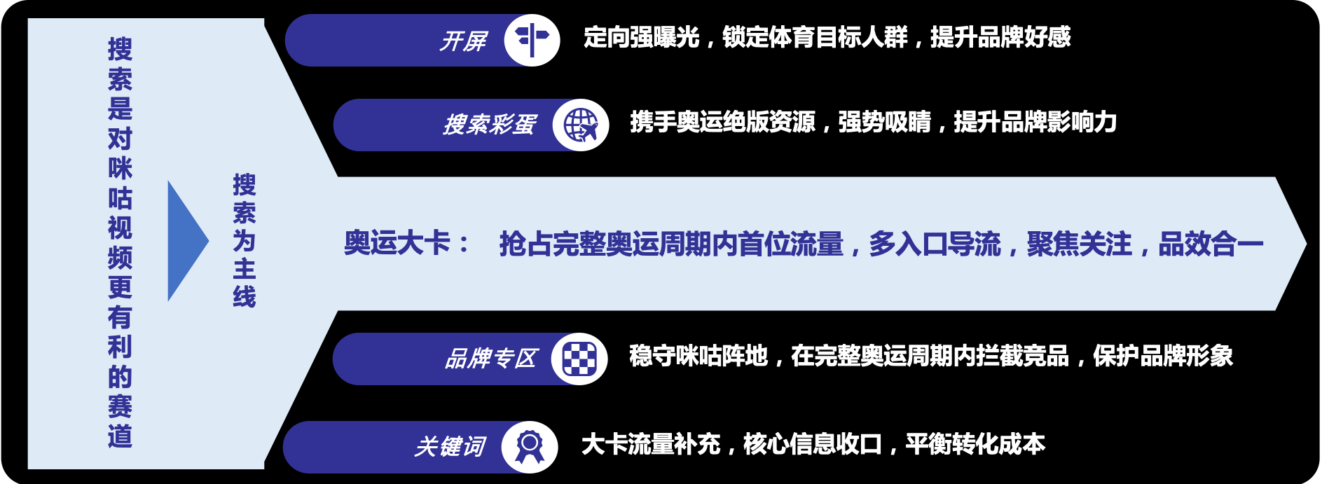 结合奥运期间的营销目标以及上述受众分析,在体育搜索领域,百度搜索平台为咪咪视频目标,因此百度营销以获取奥运流量搜索为主线,应用奥运资源实力吸睛,通过信息传播,将流量访问咪咕视频。