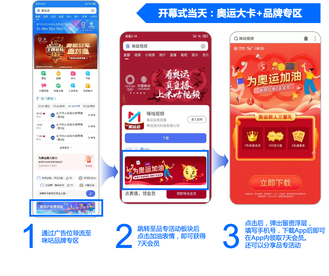 开启式当天奥运会大联合区运营活动,参与品牌提升智能指数。开启式后为更多H5下载落地页,提升转化。
