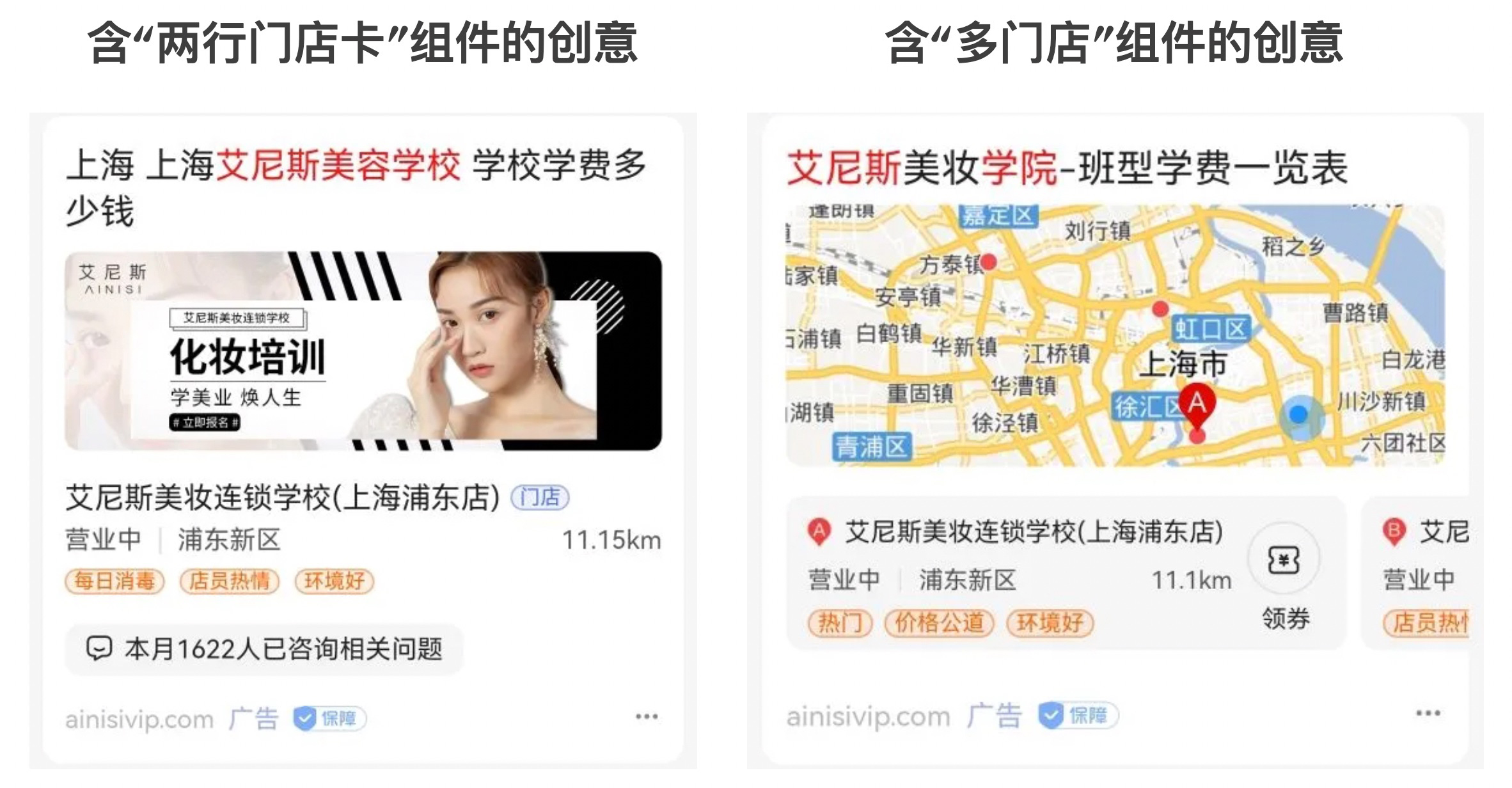 “艾尼斯”绑定了全部本地类创意组件,且本地类组件的点击率对比视频类、文字链类等普通组件高出30%以上,并且通过位置距离等信息吸引网民的注意力。