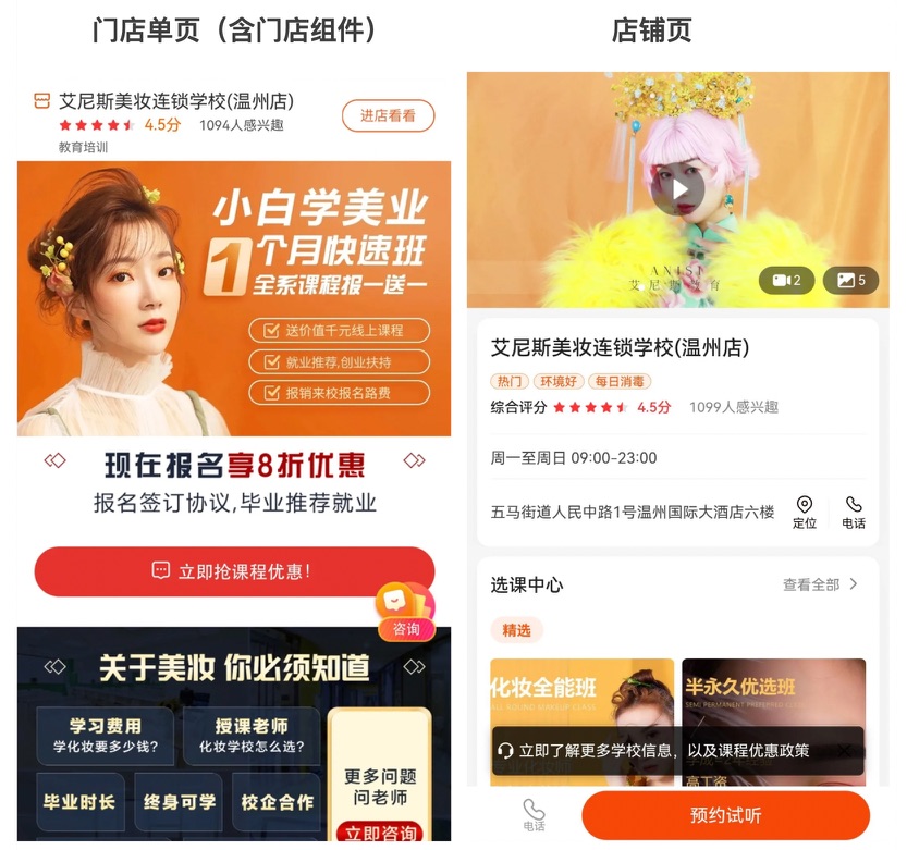 门店单页:能够凸显营销活动信息,同时展示校区信息,网民点击页面顶部的门店组件可以二跳至店铺页
