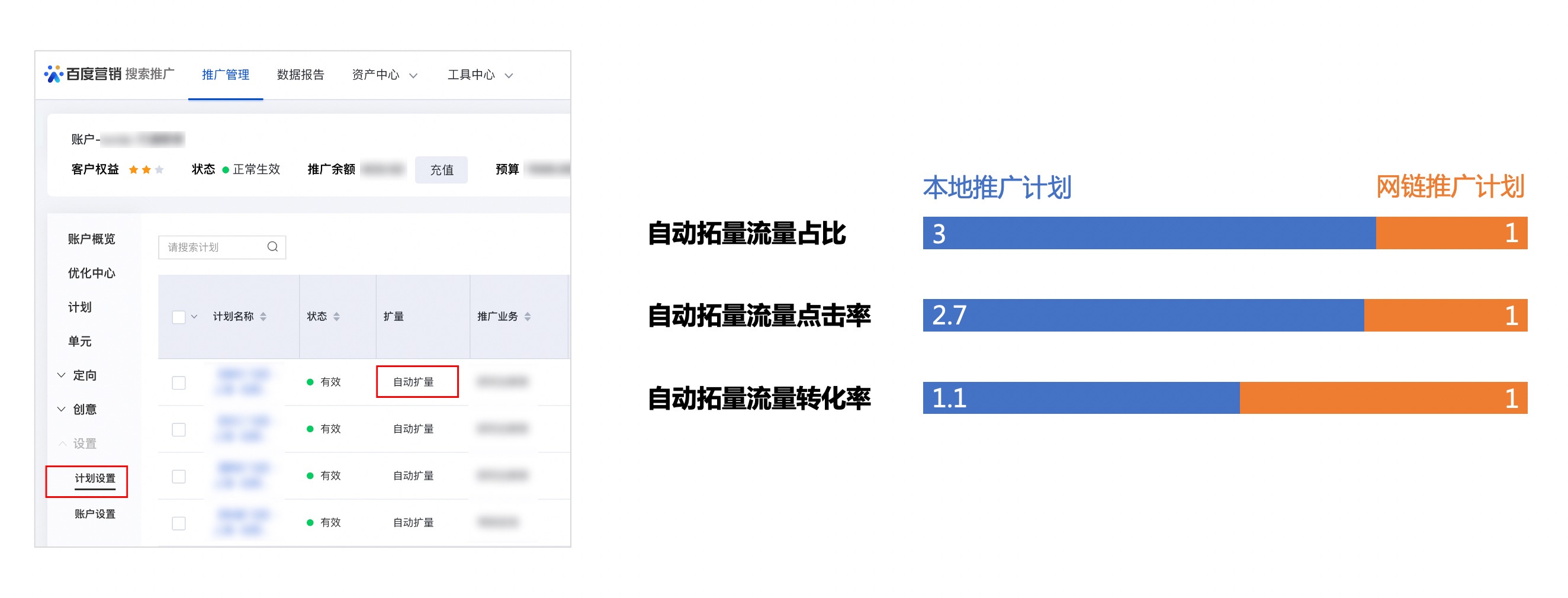“艾尼斯”本地推广计划开启了自动拓量功能,与网链推广自动拓量功能的区别是,本地推广自动拓量能够基于门店店铺页中的问答、品牌介绍、产品服务等资产信息额外拓展高相关性的关键词流量。对比“艾尼斯”本地推广和网链推广自动拓量的流量数据发现:在自动拓量流量占比方面,前者是后者的3倍;在自动拓量流量点击率方面,前者是后者的2.7倍;在自动拓量流量转化率方面,前者是后者的1.1倍。