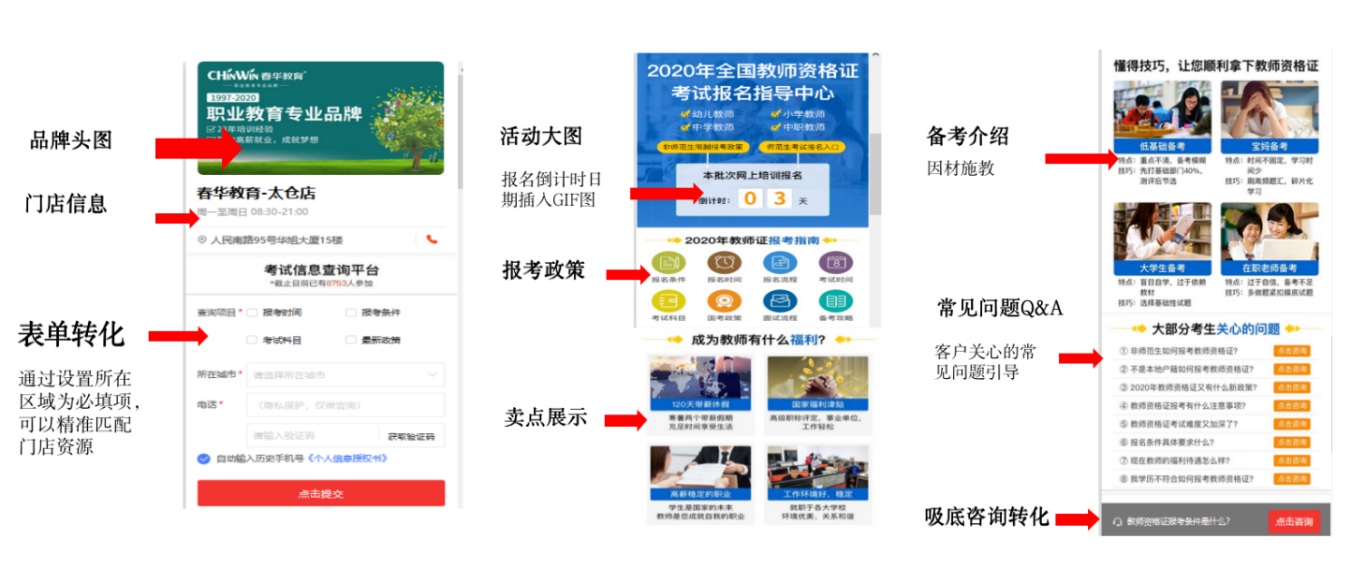 春华教育搭建“索取型”门店营销页,以咨询和表单引导解决用户需求和转化。