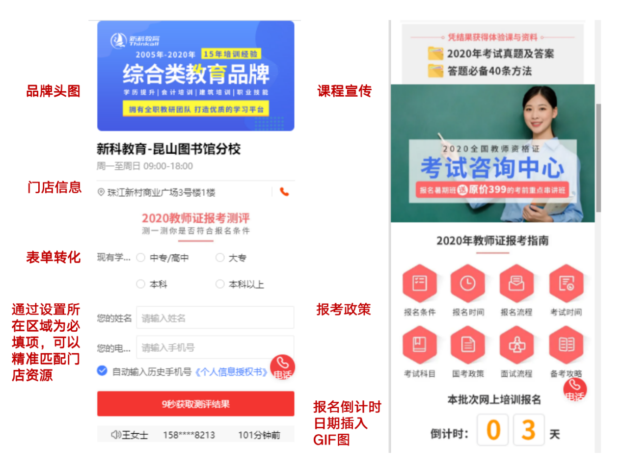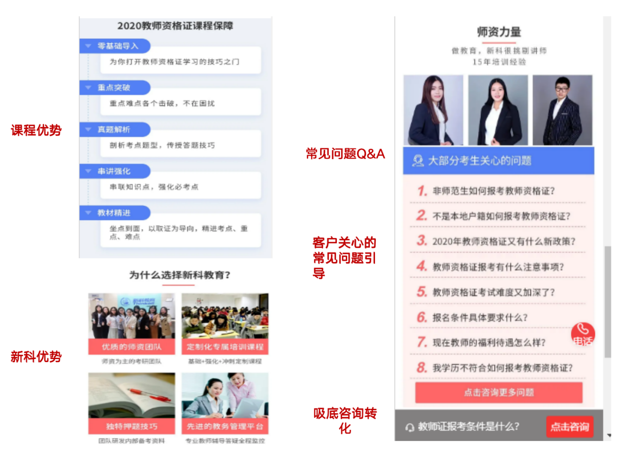 搭建门店营销页,页面添加表单组件吸引网民留资,涉及多课程产品的可做课程详情页面,通过子链跳转加强导流。