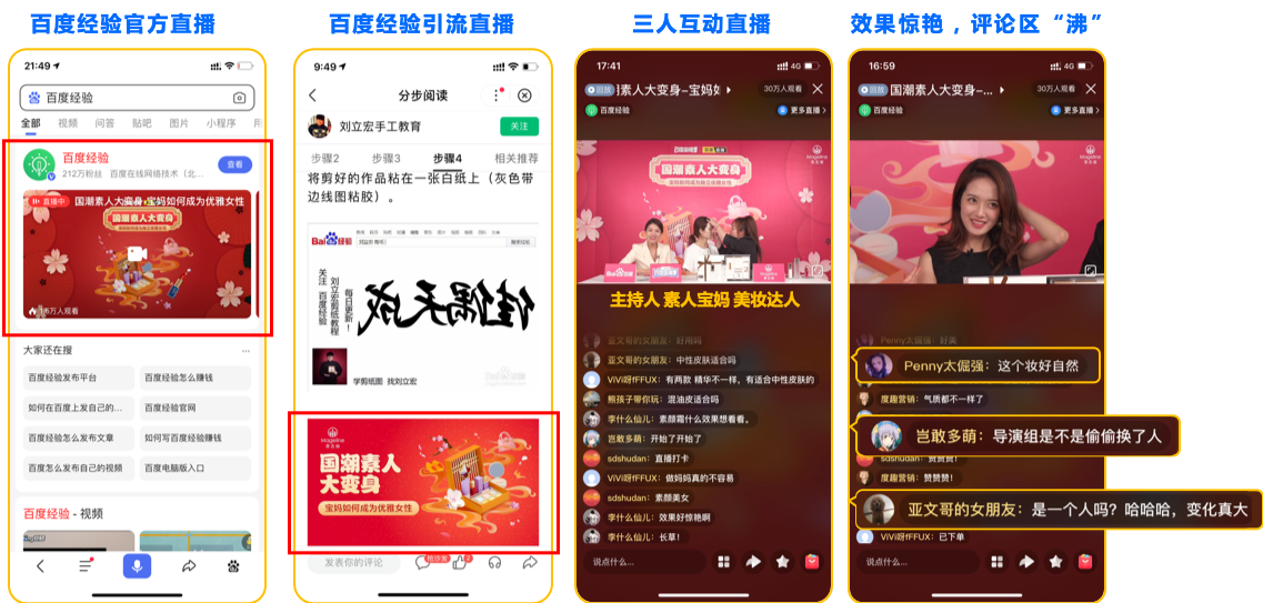 定制#国潮素人大变身——宝妈如何成为独立优雅女性#情景剧,帮助麦吉丽拉近与宝妈人群的情感距离。通过百度经验官方直播互动,总曝光1000万+,观看人次30万+。
