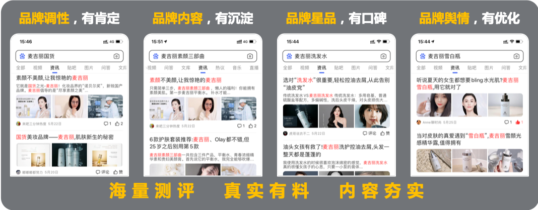 通过“百度国潮季”这一现象级IP,帮助麦吉丽从品牌、产品、研发多个维度全面深化“国货之光”的品牌标签。品牌全域曝光1.34亿+、品牌内容共创1149篇、品牌资讯指数136倍增。同时,围绕“尽享素颜之美”的品牌核心和“国货之光”的内容方向发起征文,海量且正面的舆论声音,为品牌口碑重塑迈出了有力的一步。