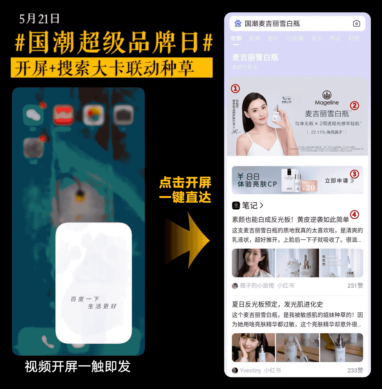 百度APP开屏联动搜索大卡,连续、多维度实现麦吉丽雪白瓶新品种草