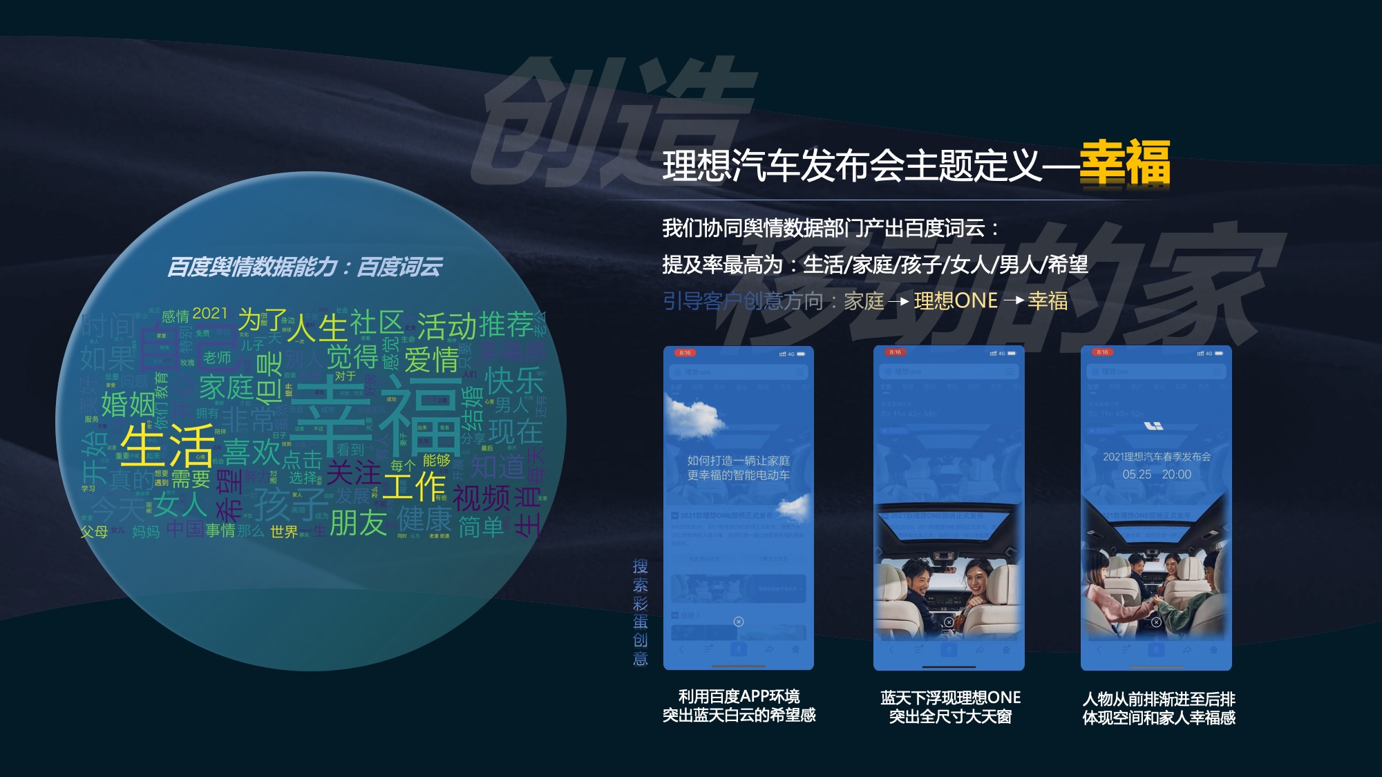 2. 百度词云能力,进一步具像化理想汽车本次发布会主题“幸福”,将抽象的概念分阶层如家庭、希望、孩子等角度,层层递进,营造“幸福”氛围,引发用户对于发布会的期待。