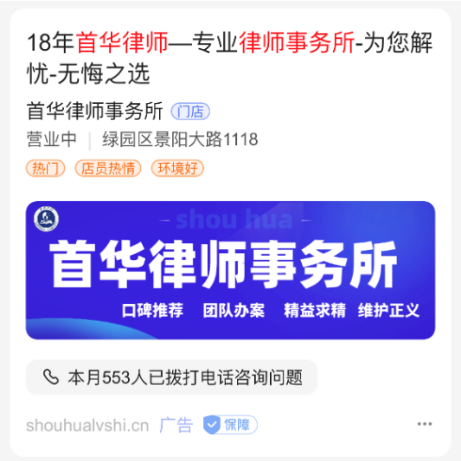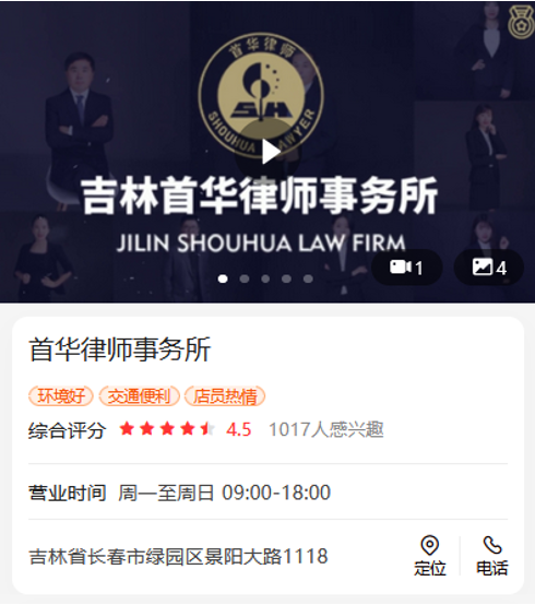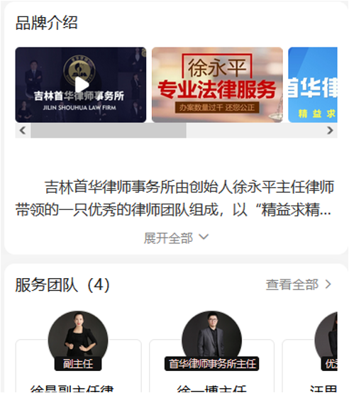 门脸、店面视频轮播展示,店铺页头图可满足对不同内容形式展示的需求,吸引网民了解律所专业实力。