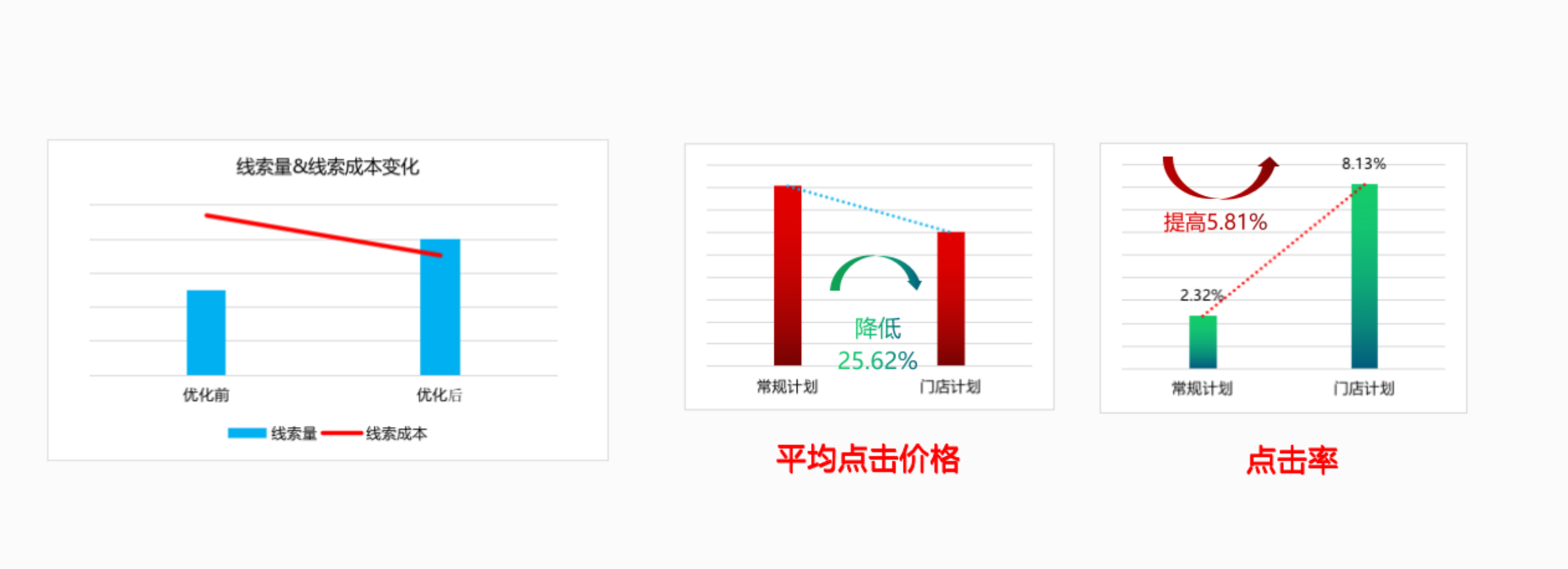 本地推广对比常规网链推广:平均点击价格:降低了25.62%;点击率:提高5.81%;线索量:提高38.75%;线索成本:降低28.63%。