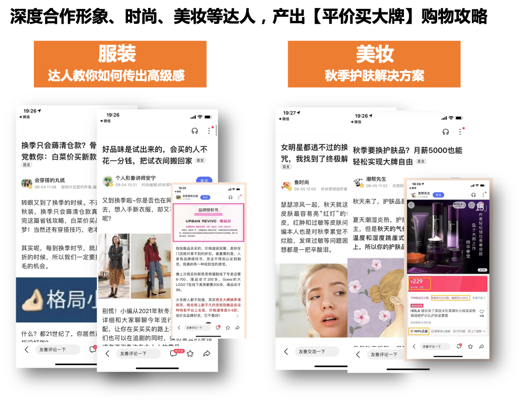 1、达人图文定制合作,优选美妆、服装类达人,进行产品测评和口碑种草;