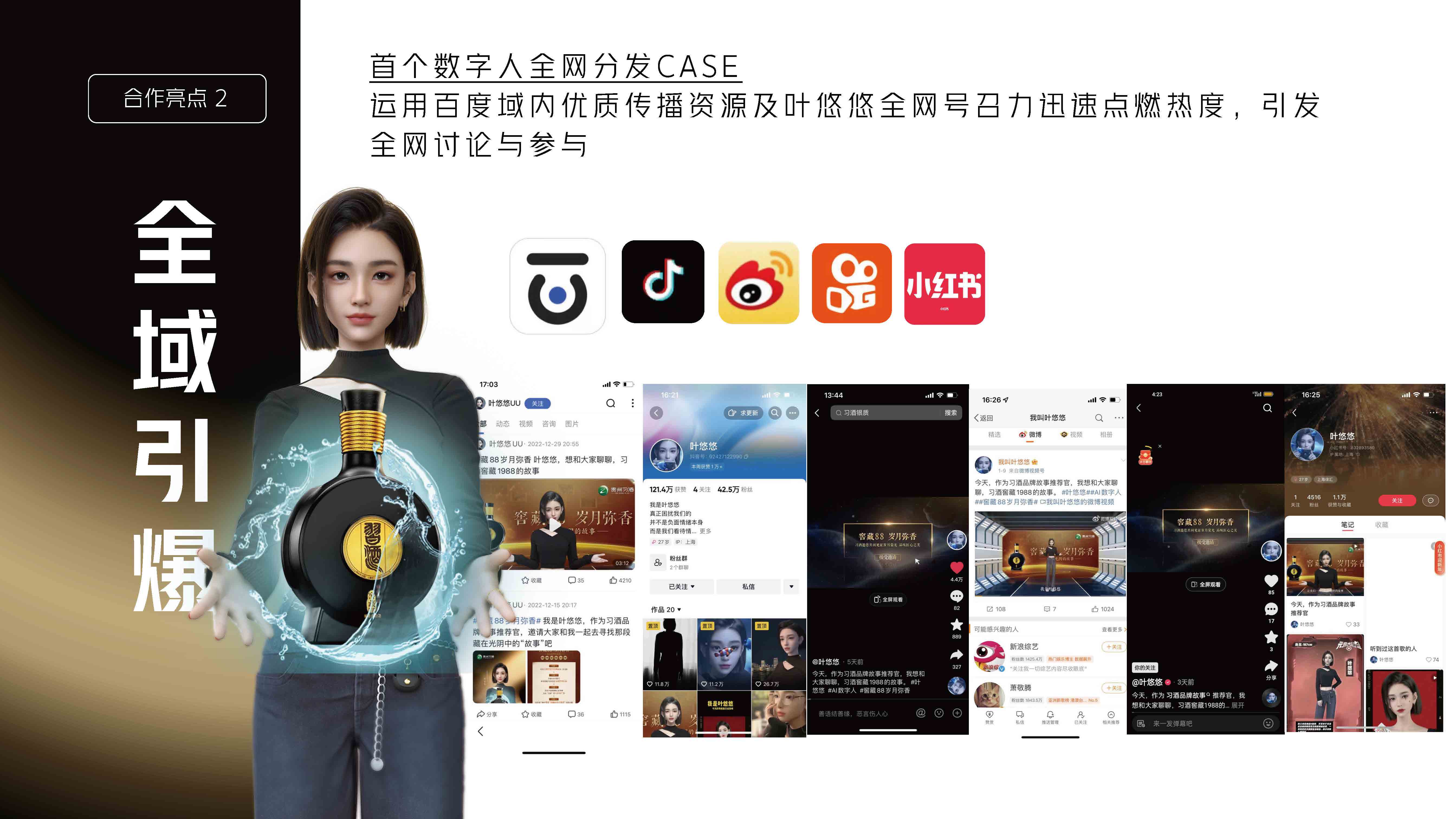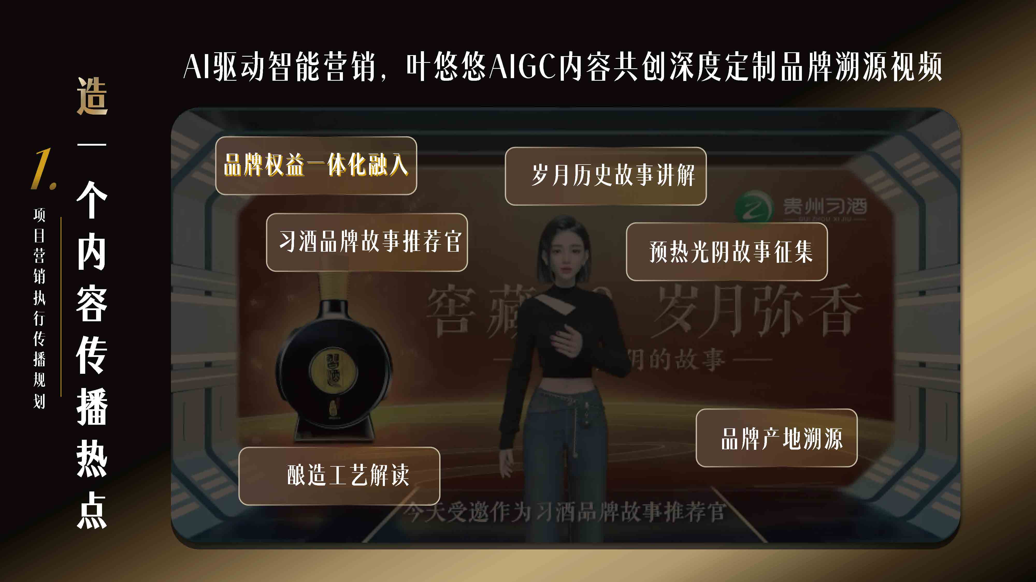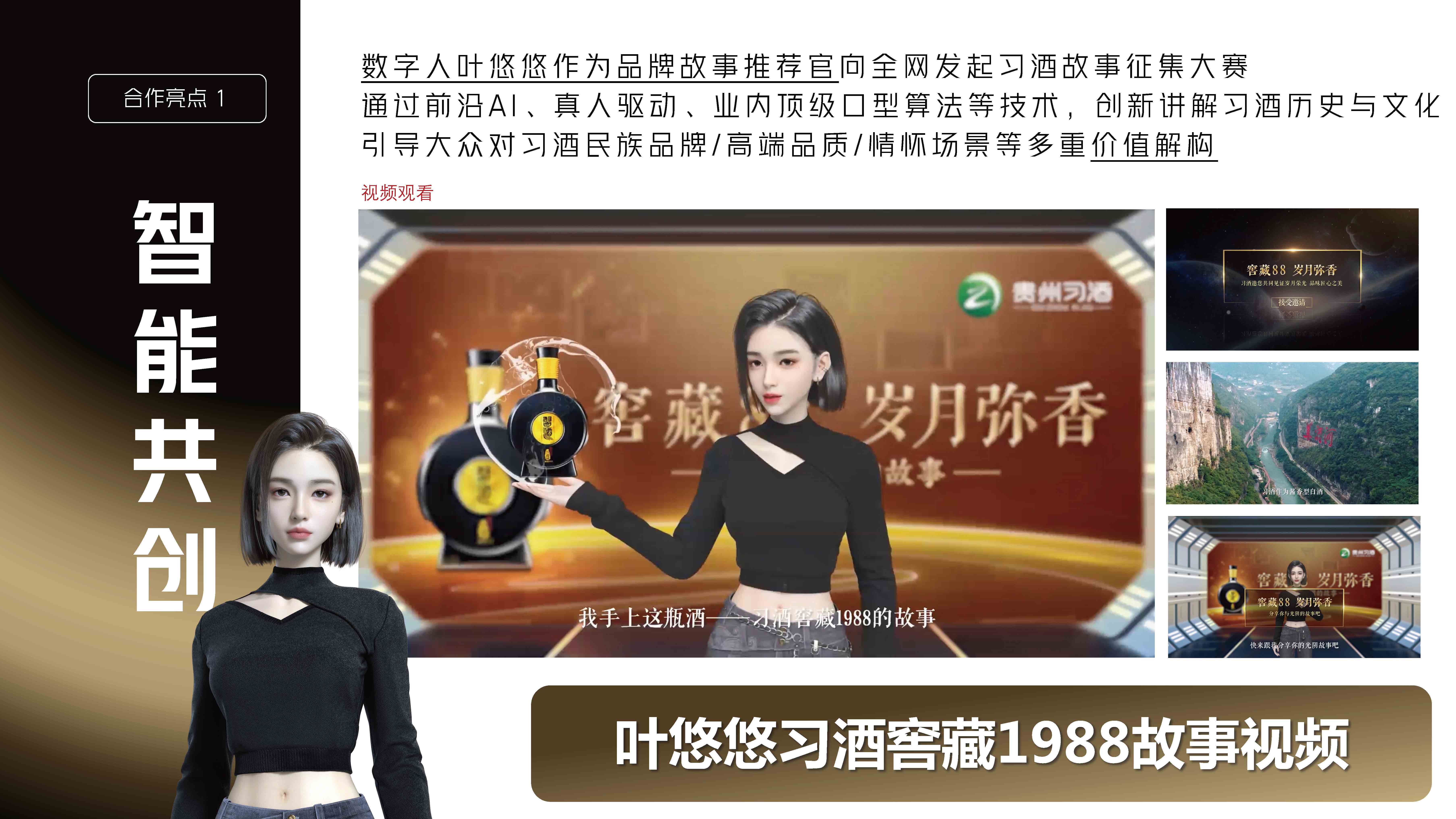 数字人叶悠悠作为品牌故事推荐官向全网发起习酒故事征集大赛,通过前沿AI、真人驱动、业内顶级口型算法等技术,创新讲解习酒历史与文化,引导大众对习酒民族品牌/高端品质/情怀场景等多重价值解构。