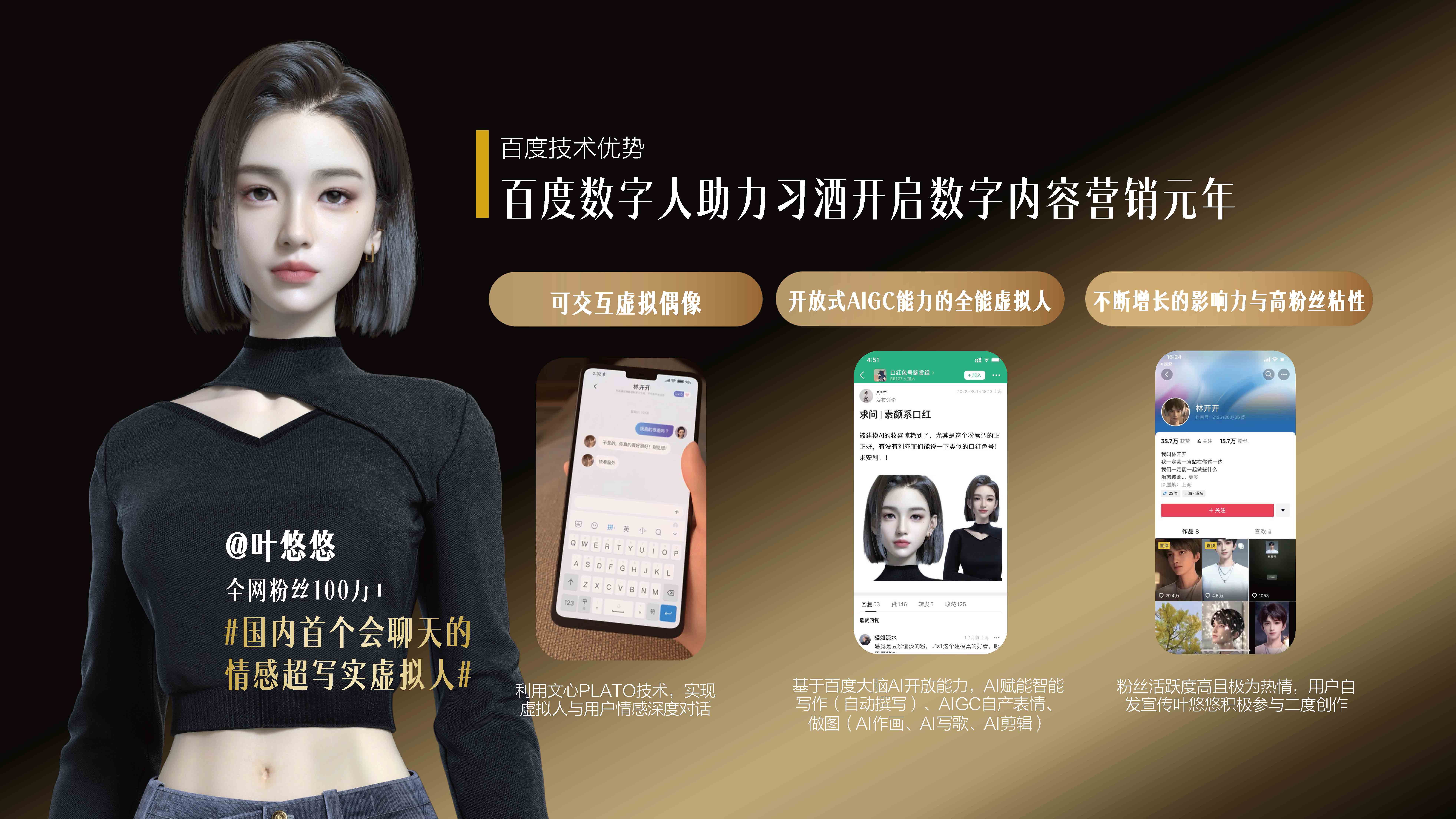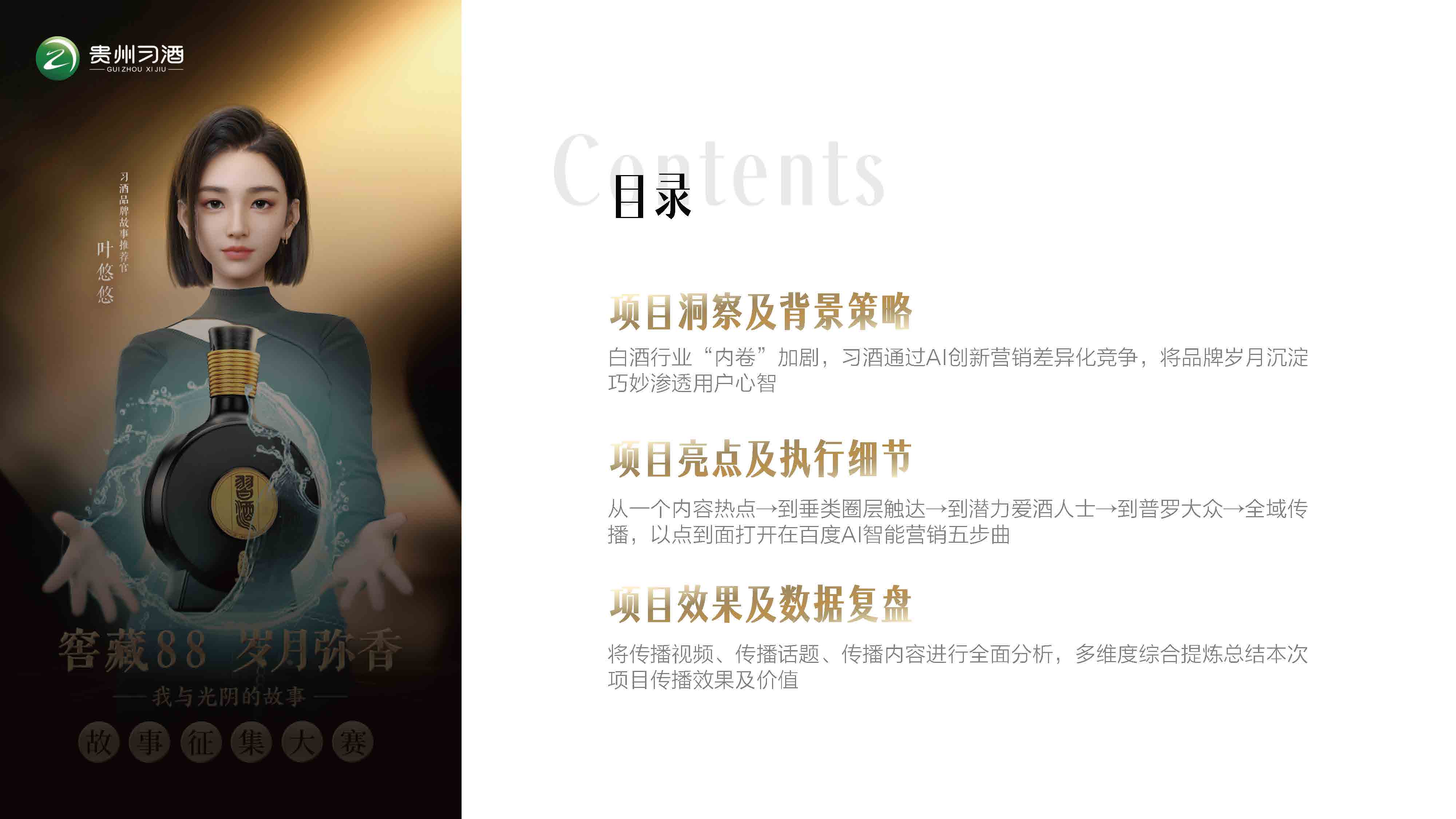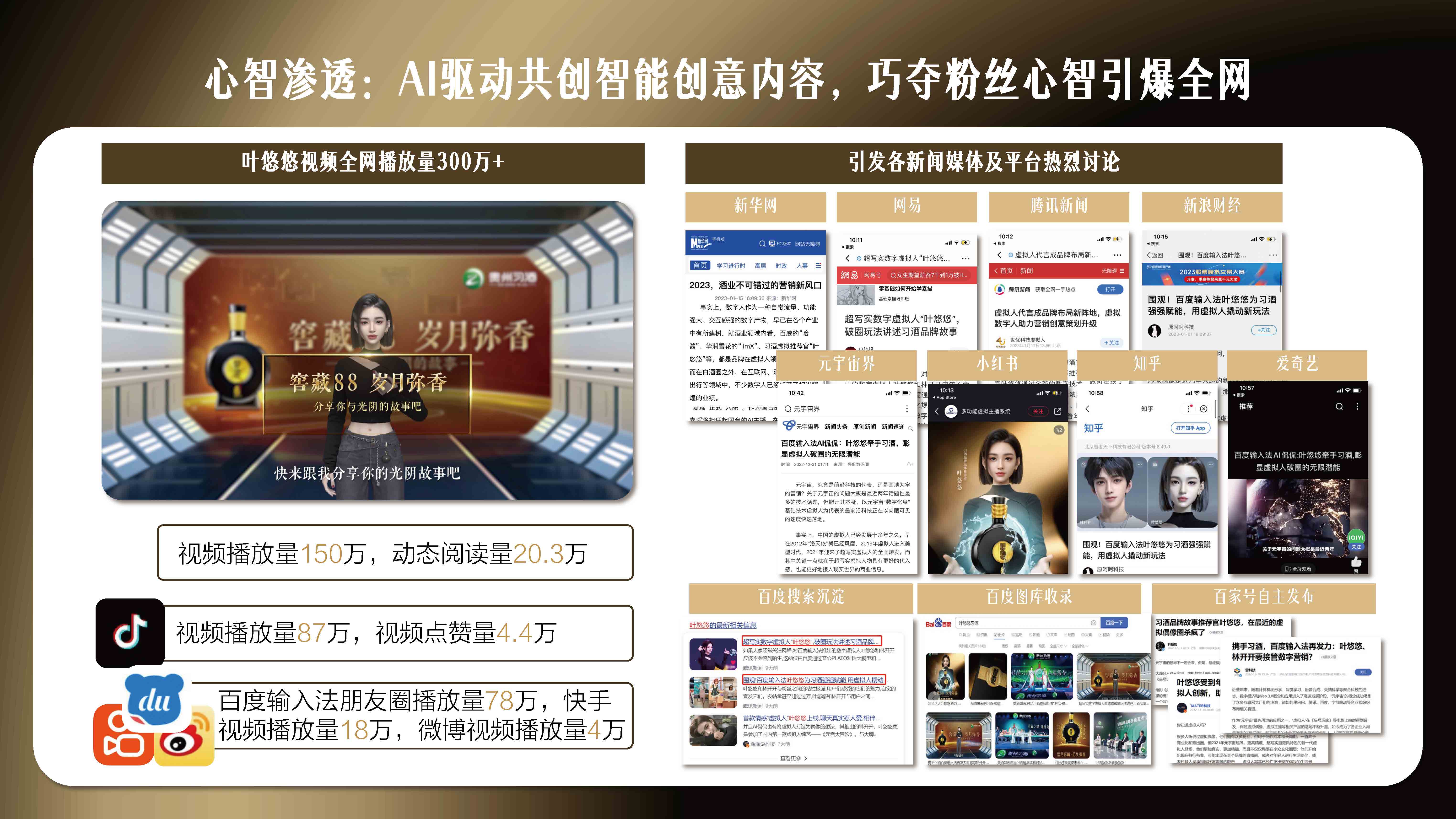 数字人叶悠悠作为品牌故事推荐官向全网发起习酒故事征集大赛,通过前沿AI、真人驱动、业内顶级口型算法等技术,创新讲解习酒历史与文化,引导大众对习酒民族品牌/高端品质/情怀场景等多重价值解构。
