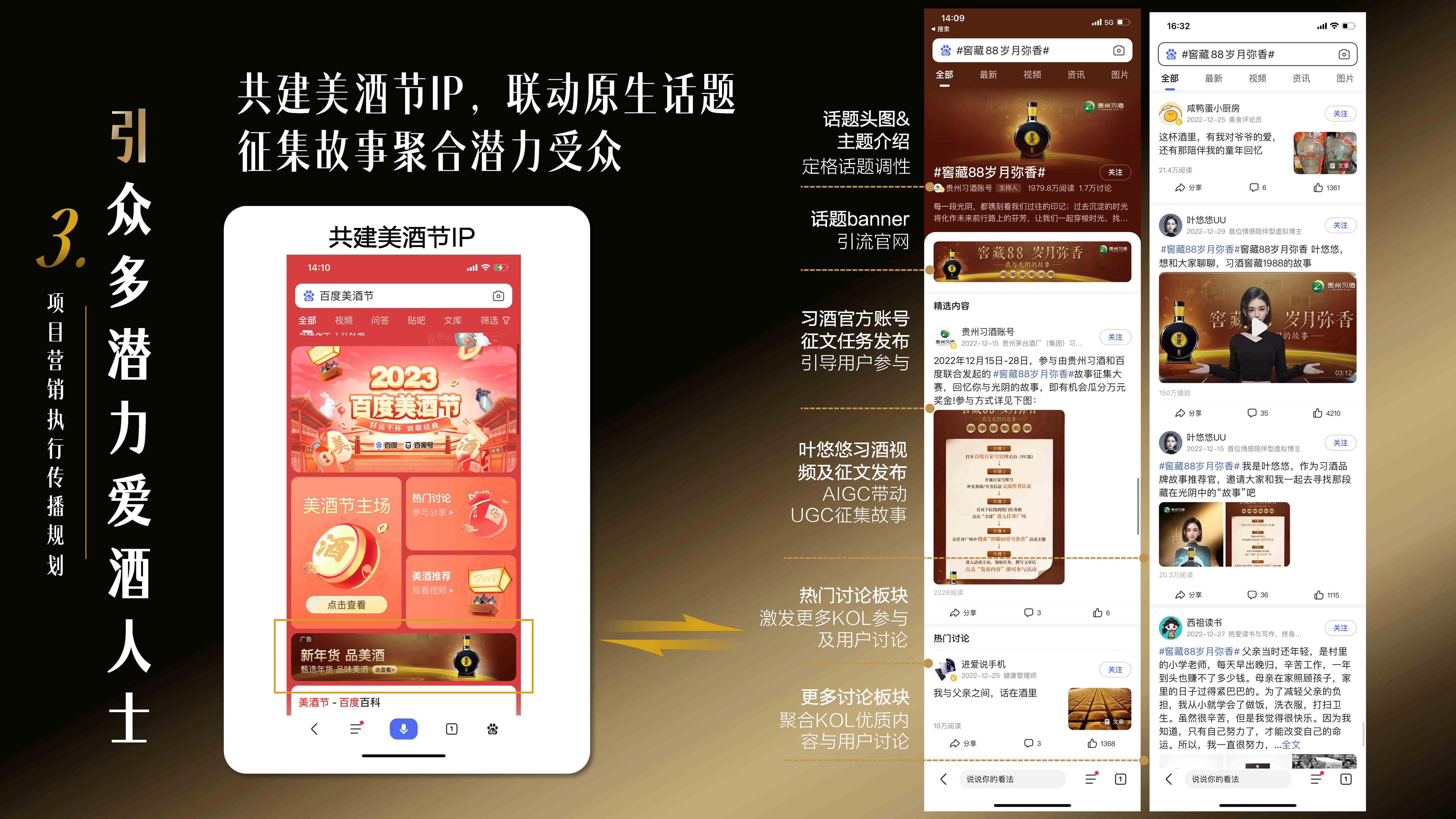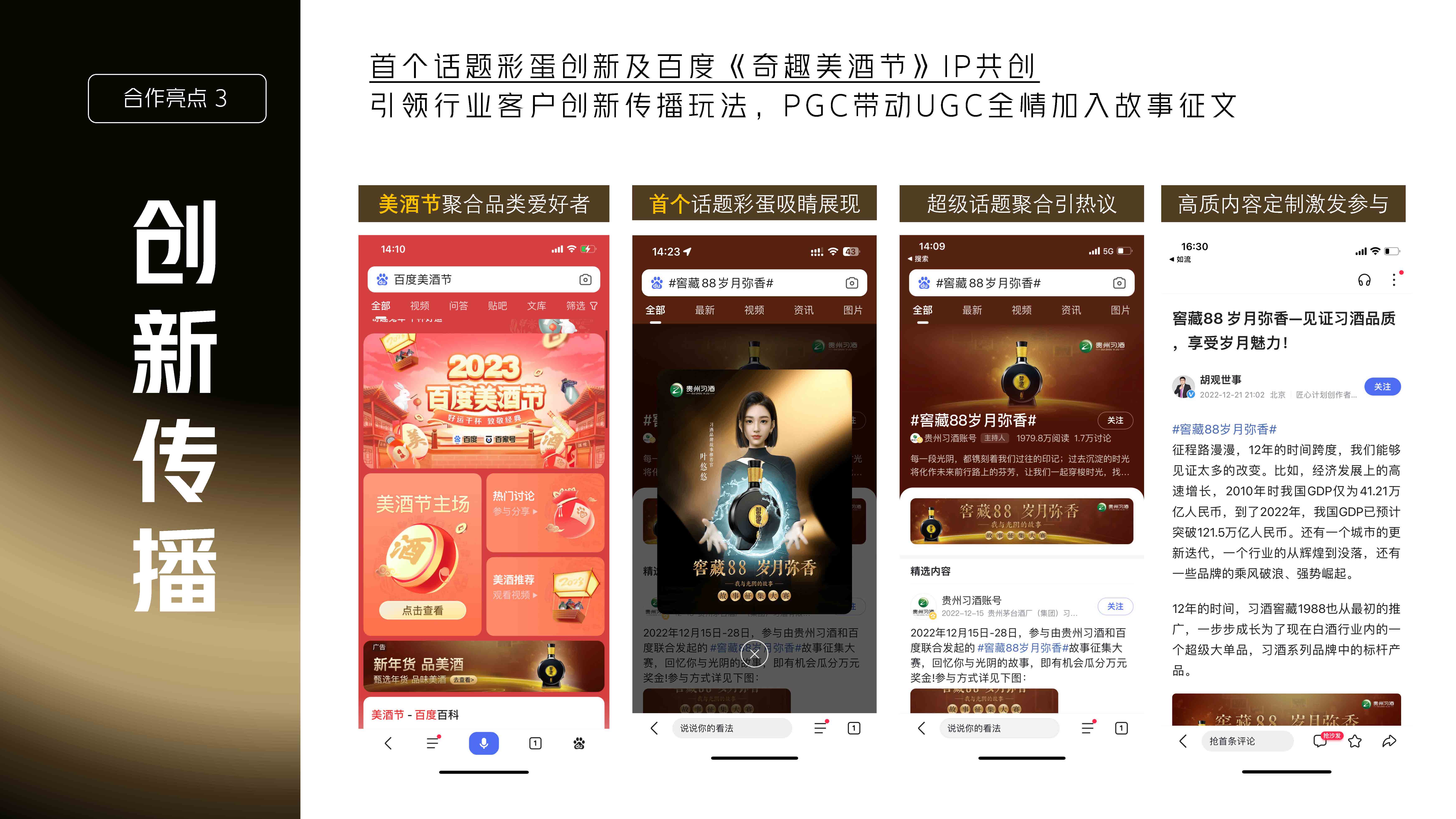 首个话题彩蛋创新及百度《奇趣美酒节》IP共创,引领行业客户创新传播玩法,PGC带动UGC全情加入故事征文