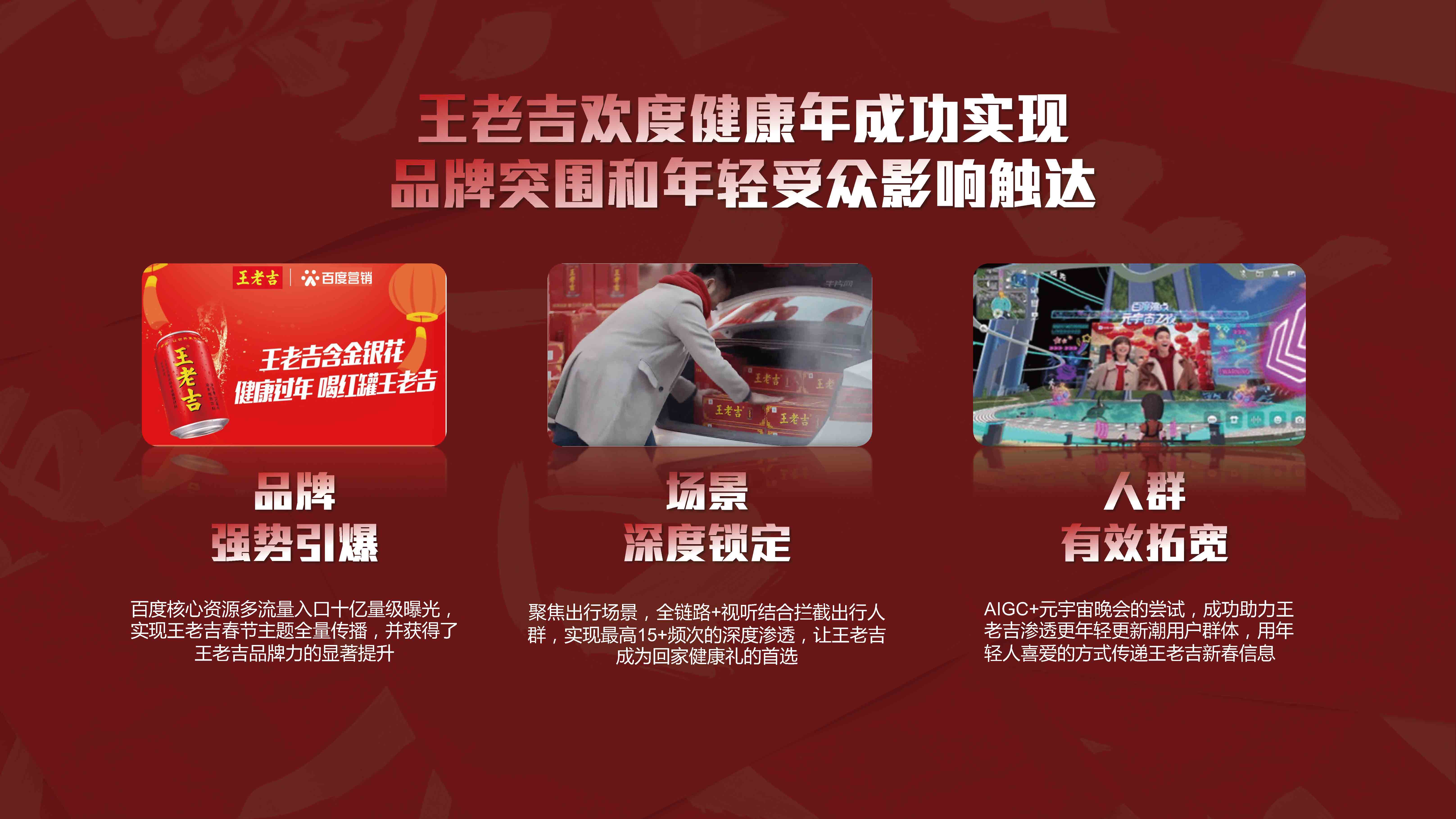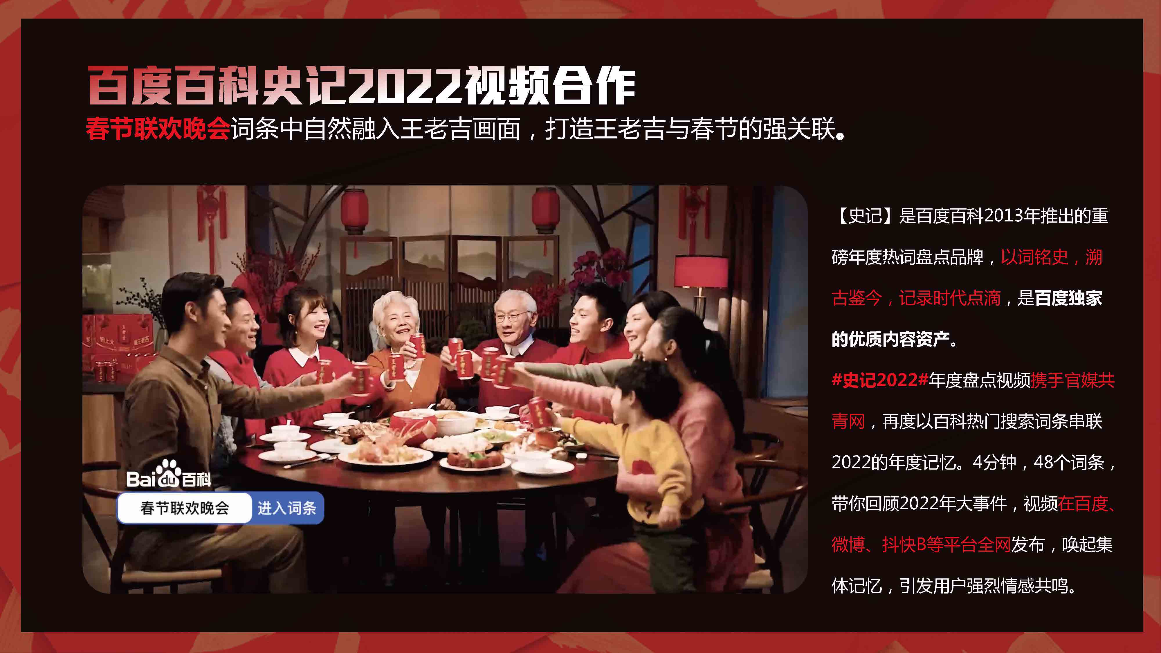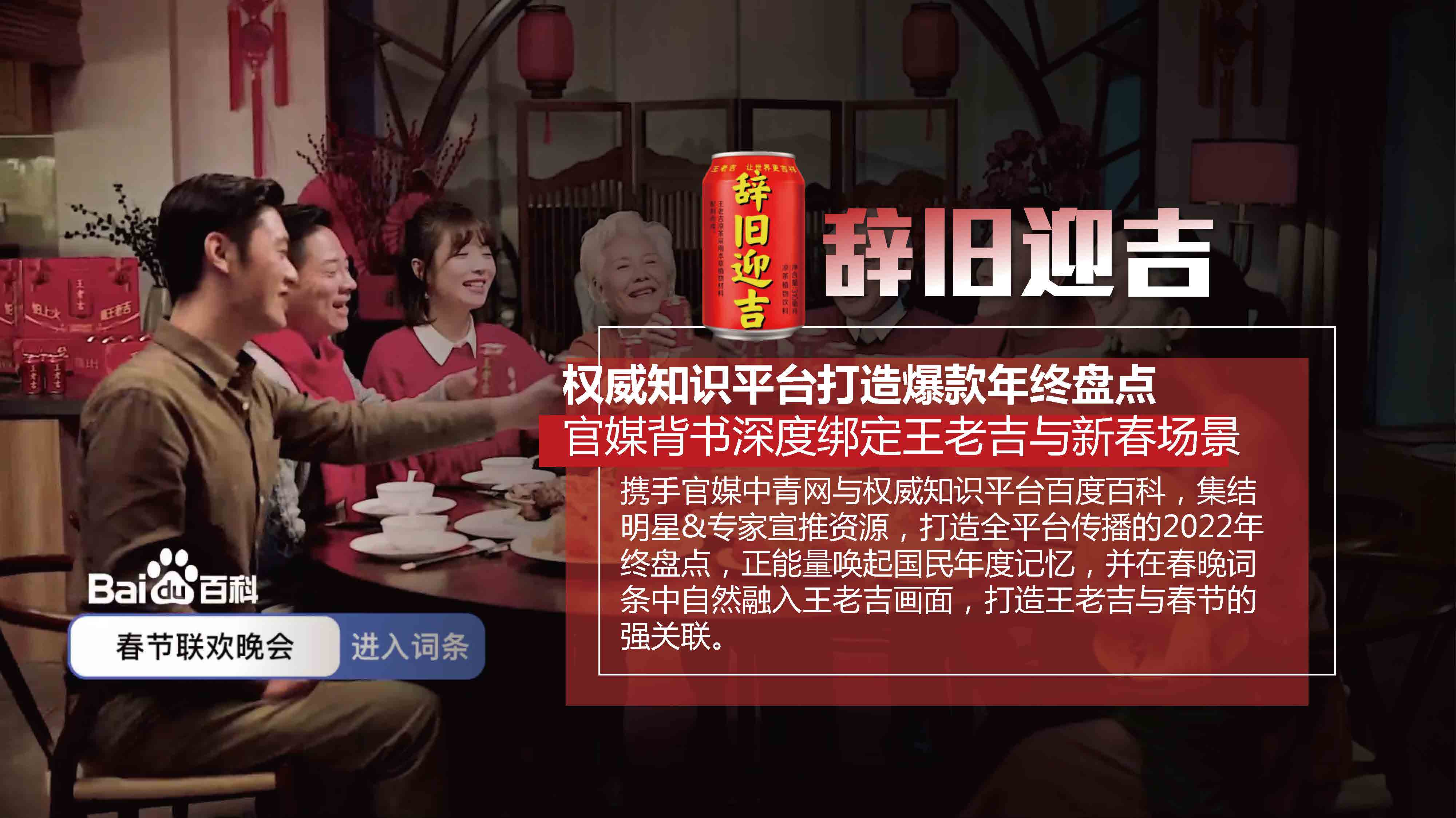 携手官媒中青网与权威知识平台百度百科,集结明星&专家宣推资源,打造全平台传播的年终盘点,正能量唤起国民年度记忆,结合春晚词条自然融入王老吉画面,打造王老吉与春节的强关联。