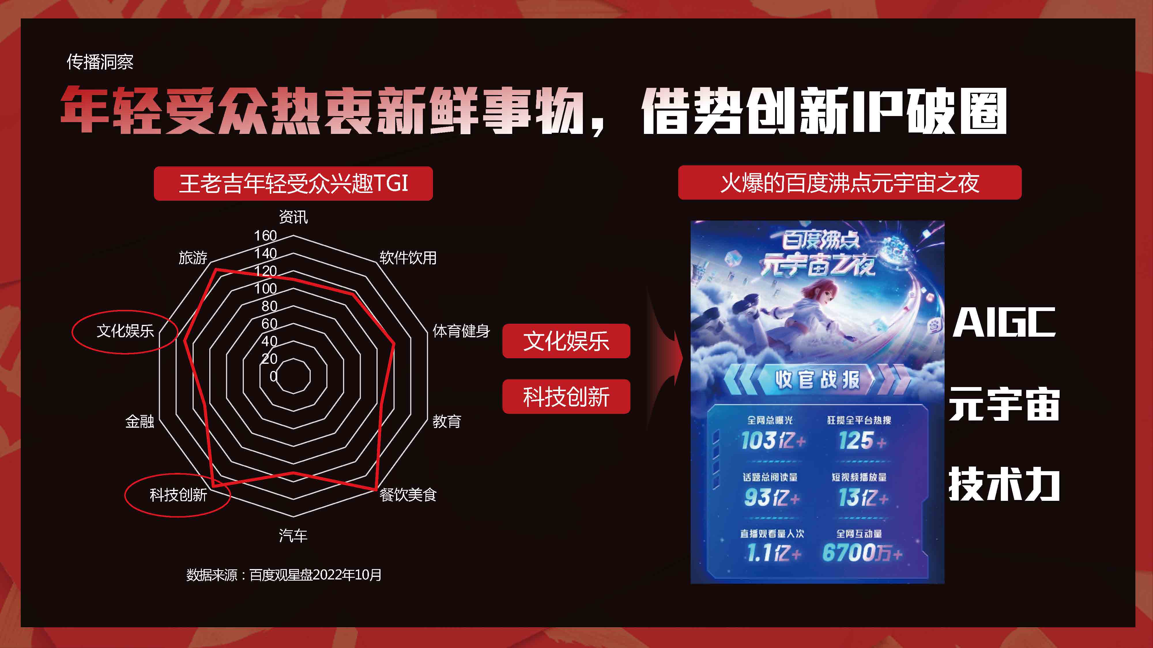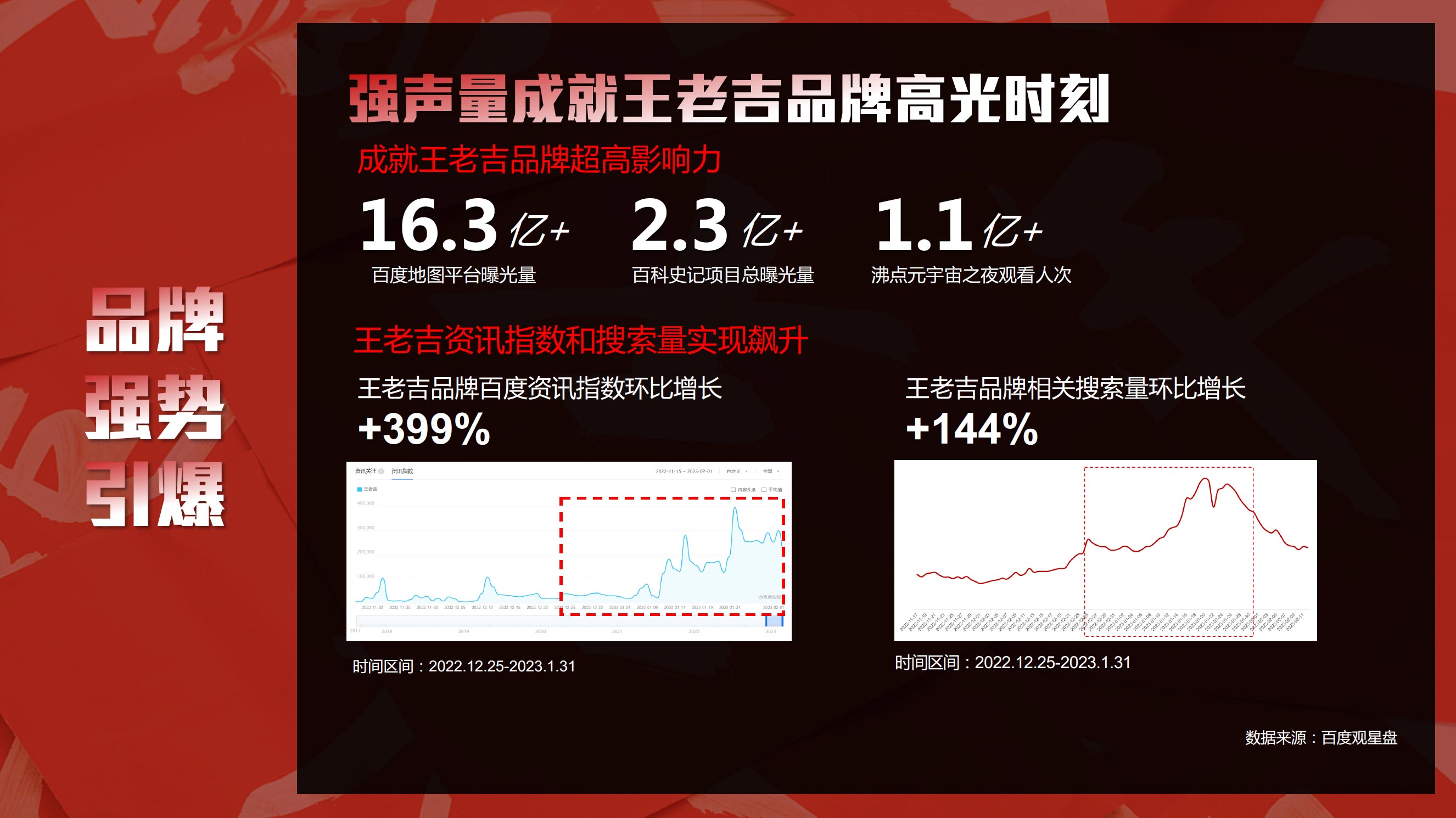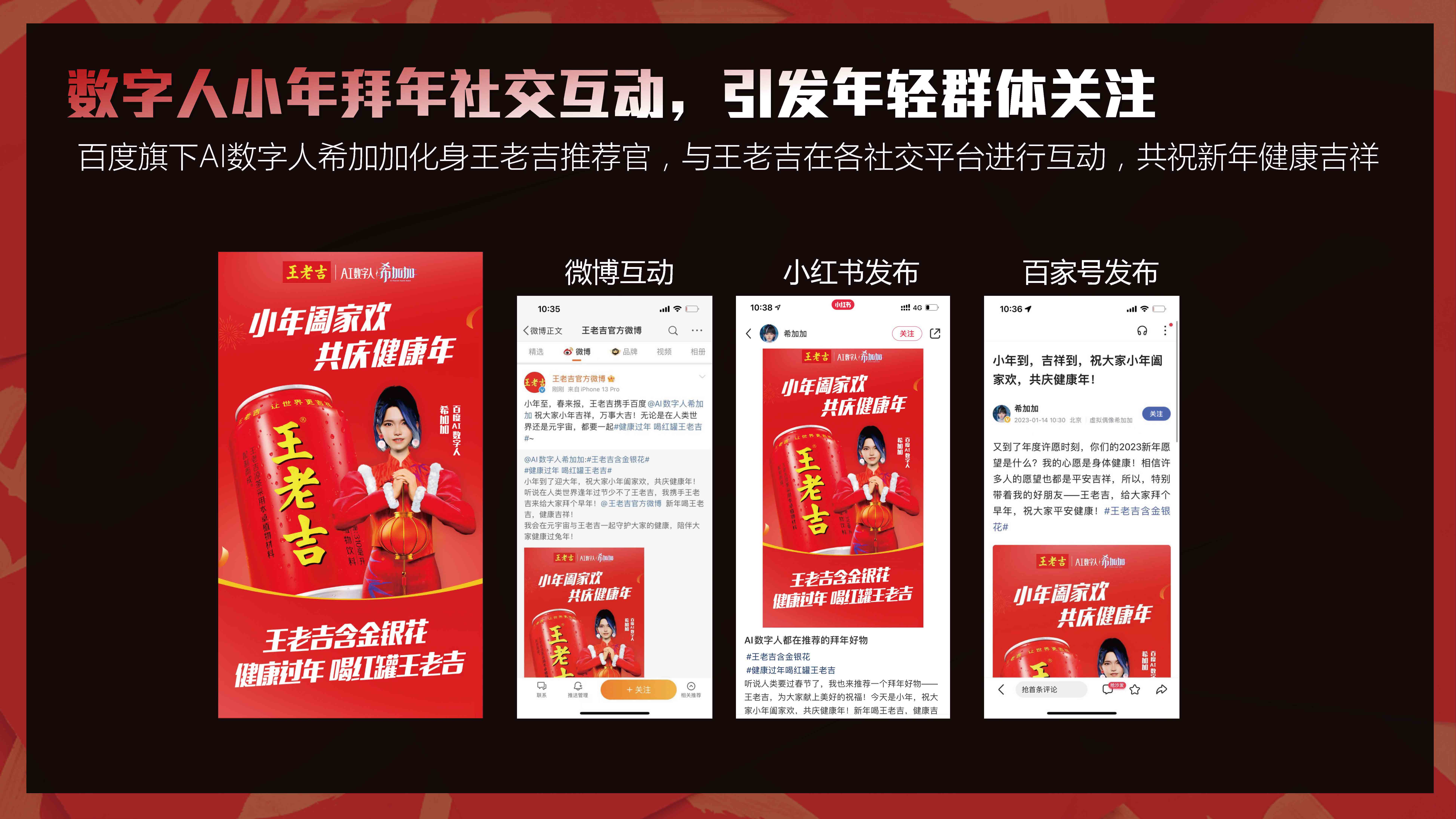 携手官媒中青网与权威知识平台百度百科,集结明星&专家宣推资源,打造全平台传播的年终盘点,正能量唤起国民年度记忆,结合春晚词条自然融入王老吉画面,打造王老吉与春节的强关联。