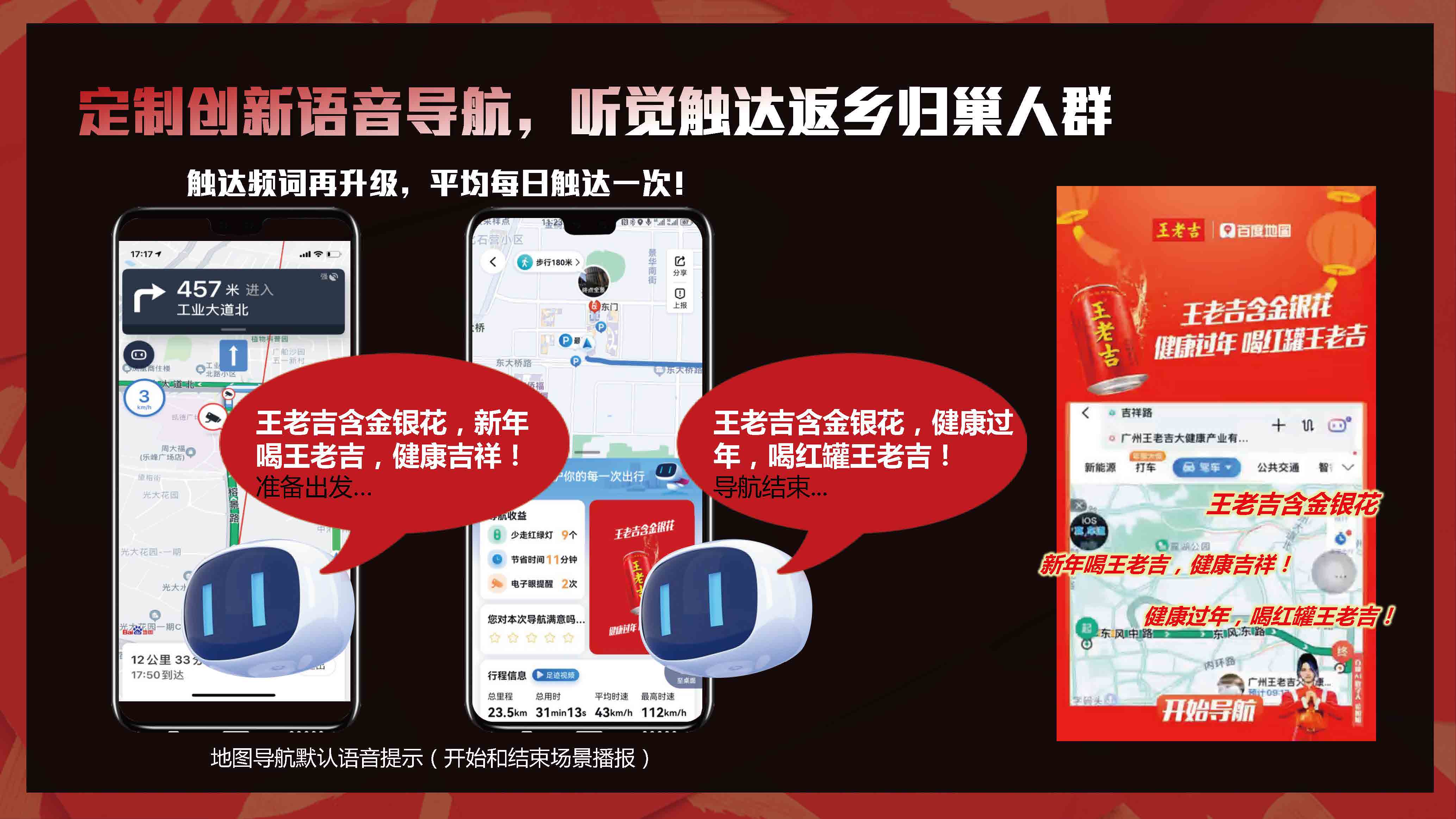运用百度地图,通过语音导航与百度地图的强曝光,在导航前、中、后全链路拦截双旦跨年出行人群,前置性地将品牌主题深度植入用户心中。