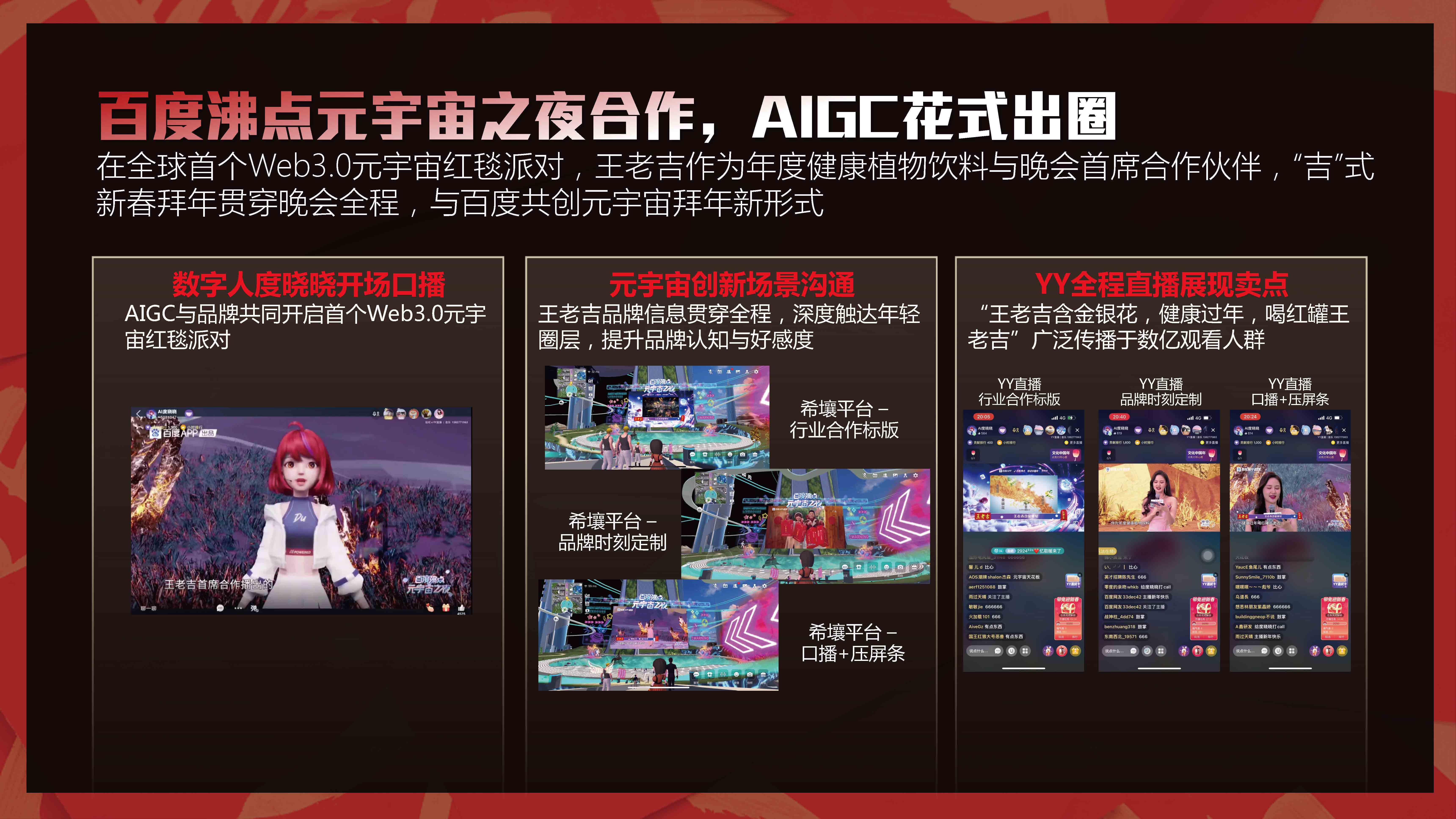 数字人希加加化身推荐官,与王老吉在各社交平台进行互动宣传。数字人度晓晓在全球首个Web3.0元宇宙红毯派对——沸点元宇宙之夜携众明星共创元宇宙新年盛宴。带动了年轻群体对品牌的认知度及好感度。