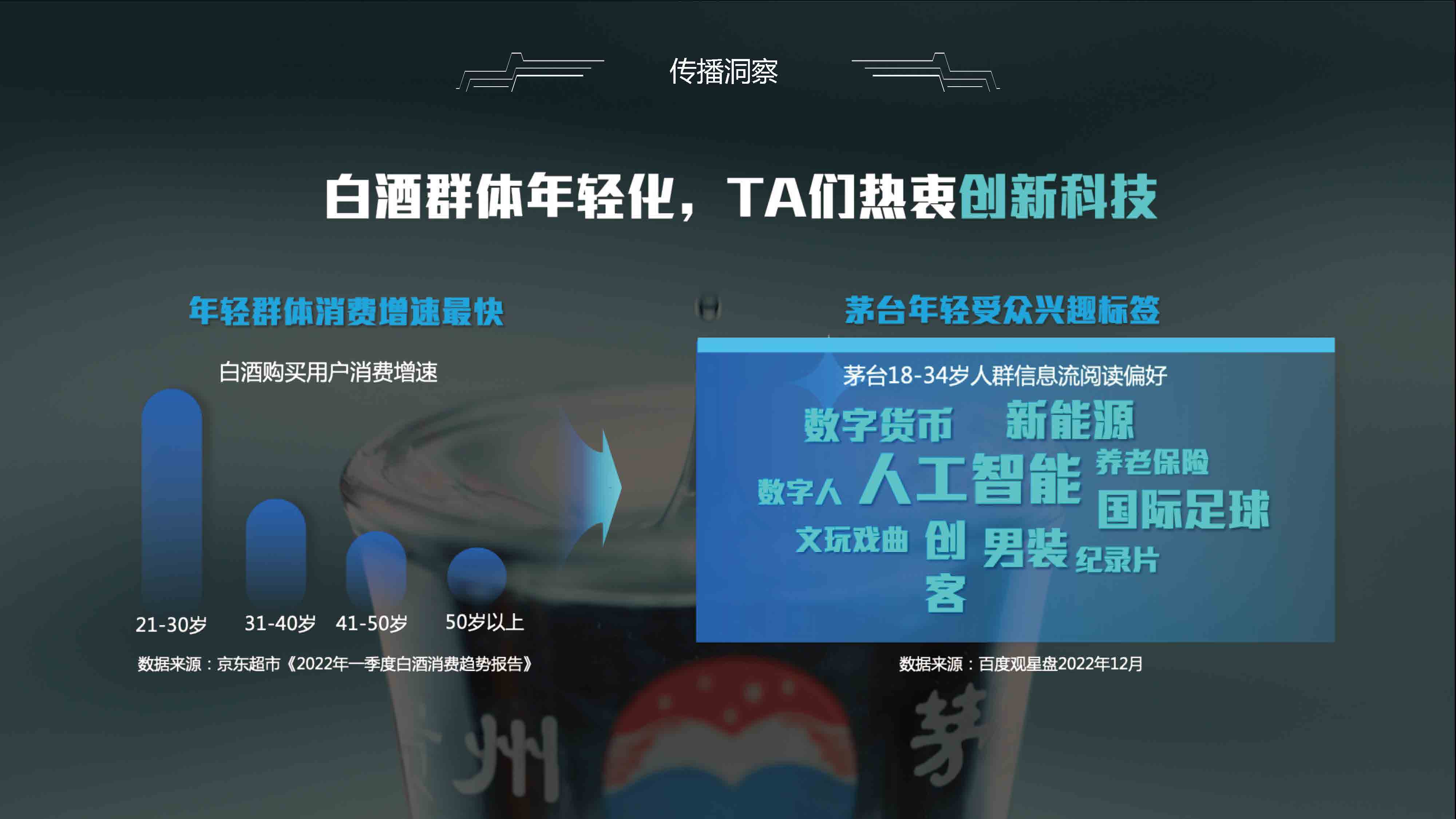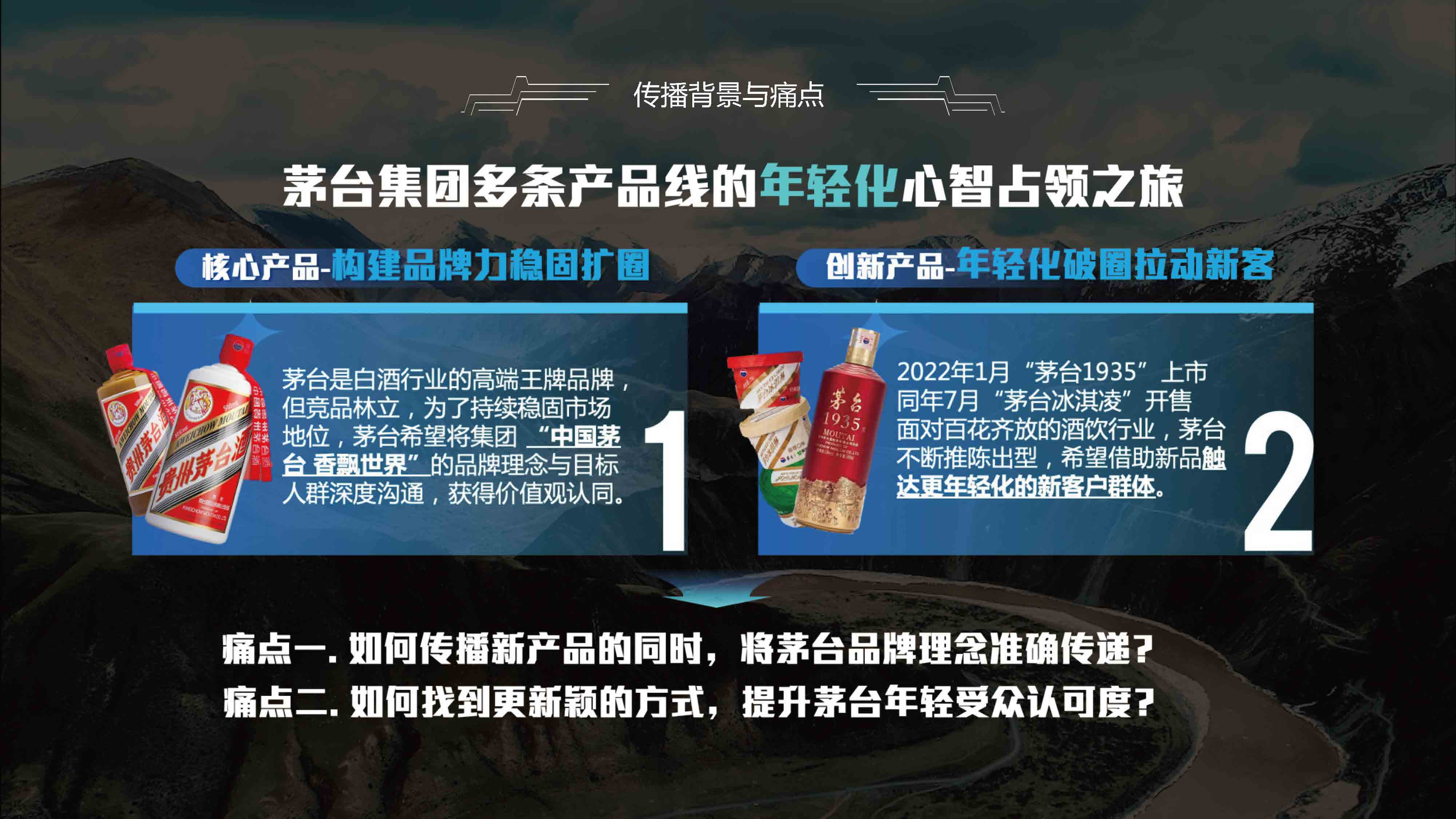 茅台是白酒行业的高端王牌品牌,但竞品林立,为了持续稳固市场地位,茅台希望将集团 “中国茅台 香飘世界”的品牌理念与目标人群深度沟通,获得价值观认同。2022年1月“茅台1935”上市,同年7月“茅台冰淇凌”开售面对百花齐放的酒饮行业,茅台不断推陈出型,希望借助新品触达更年轻化的新客户群体。