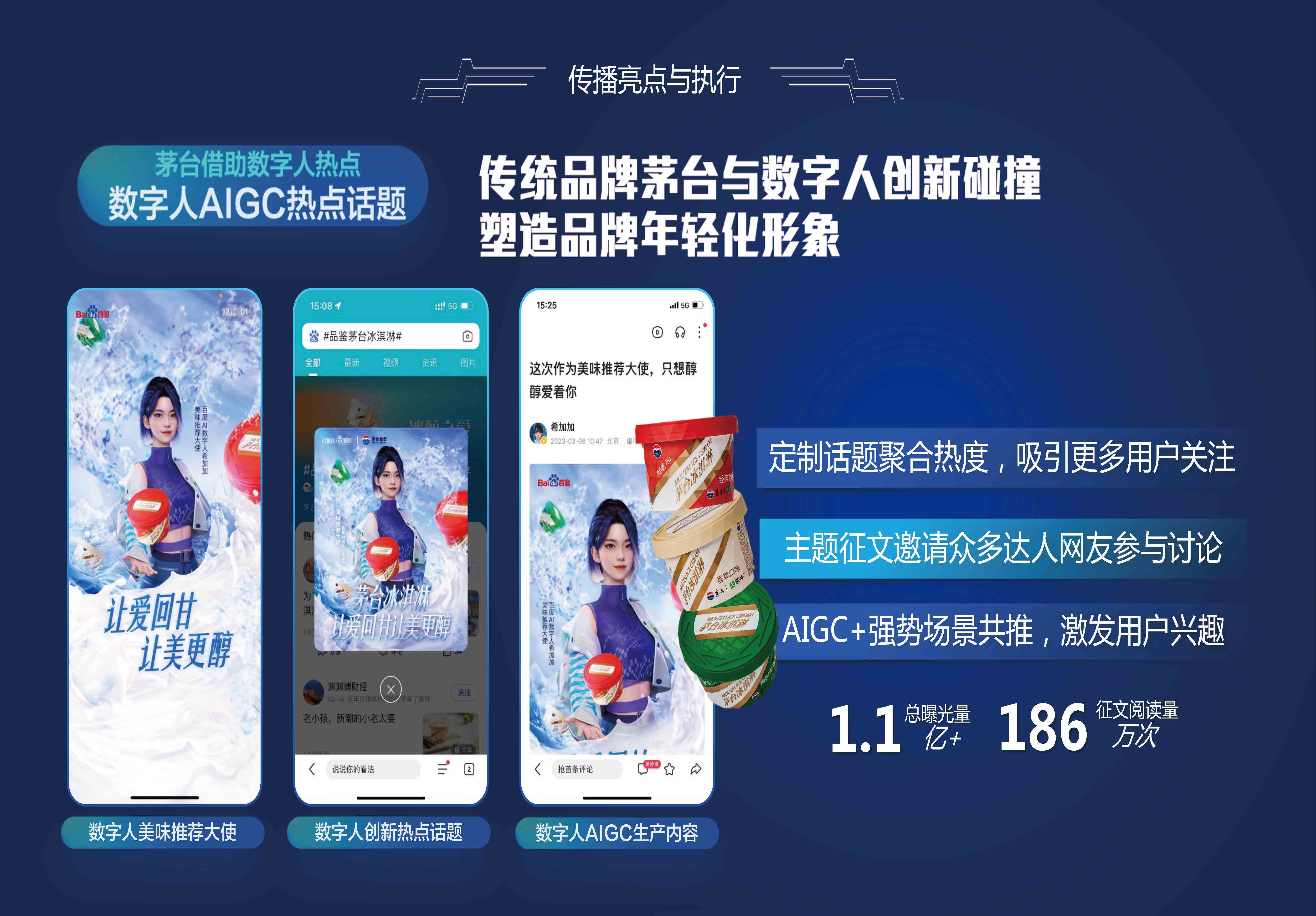 传统品牌茅台与数字人创新碰撞塑造品牌年轻化形象,话题总曝光1.1亿+,征文阅读量186万次。