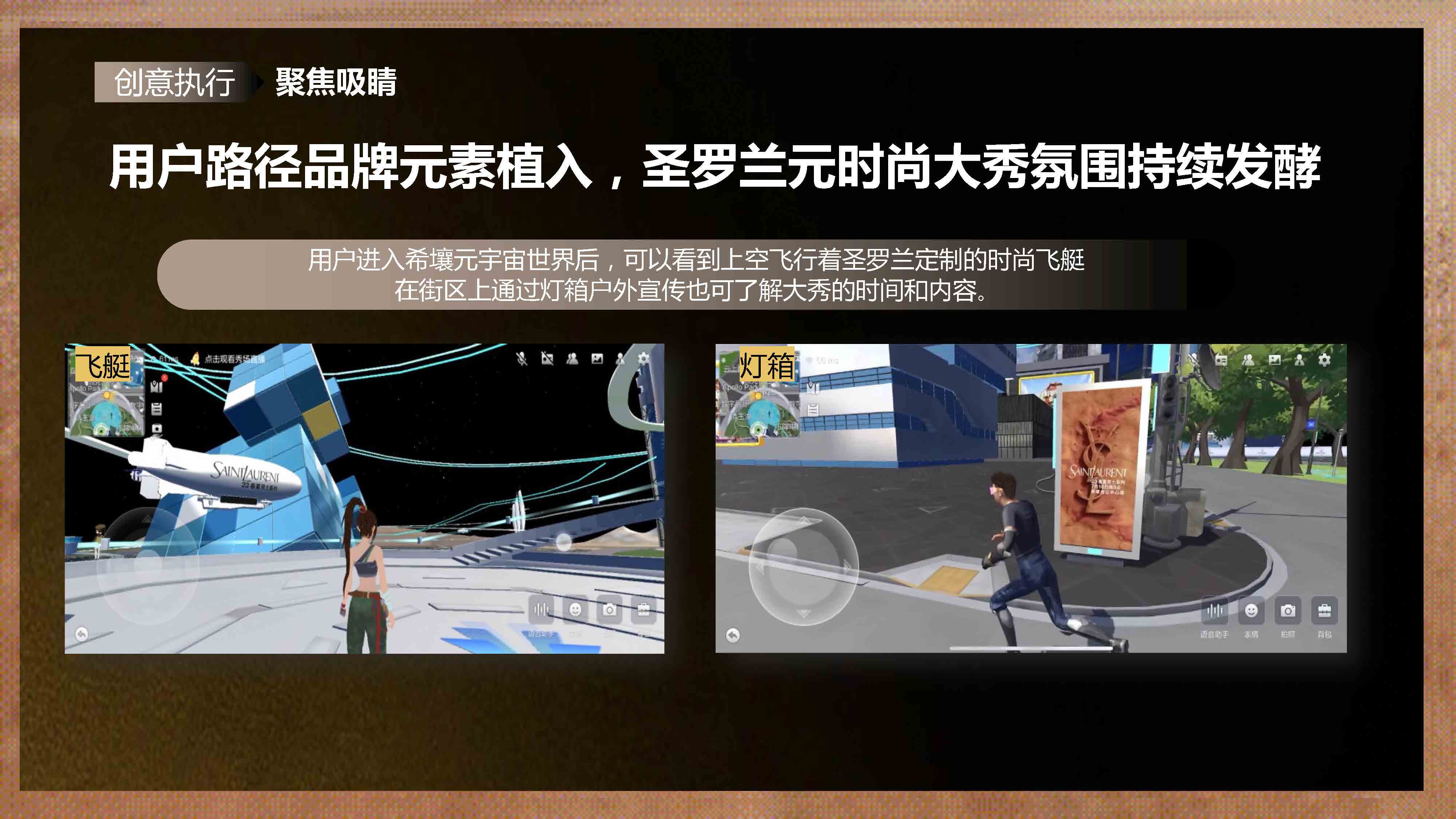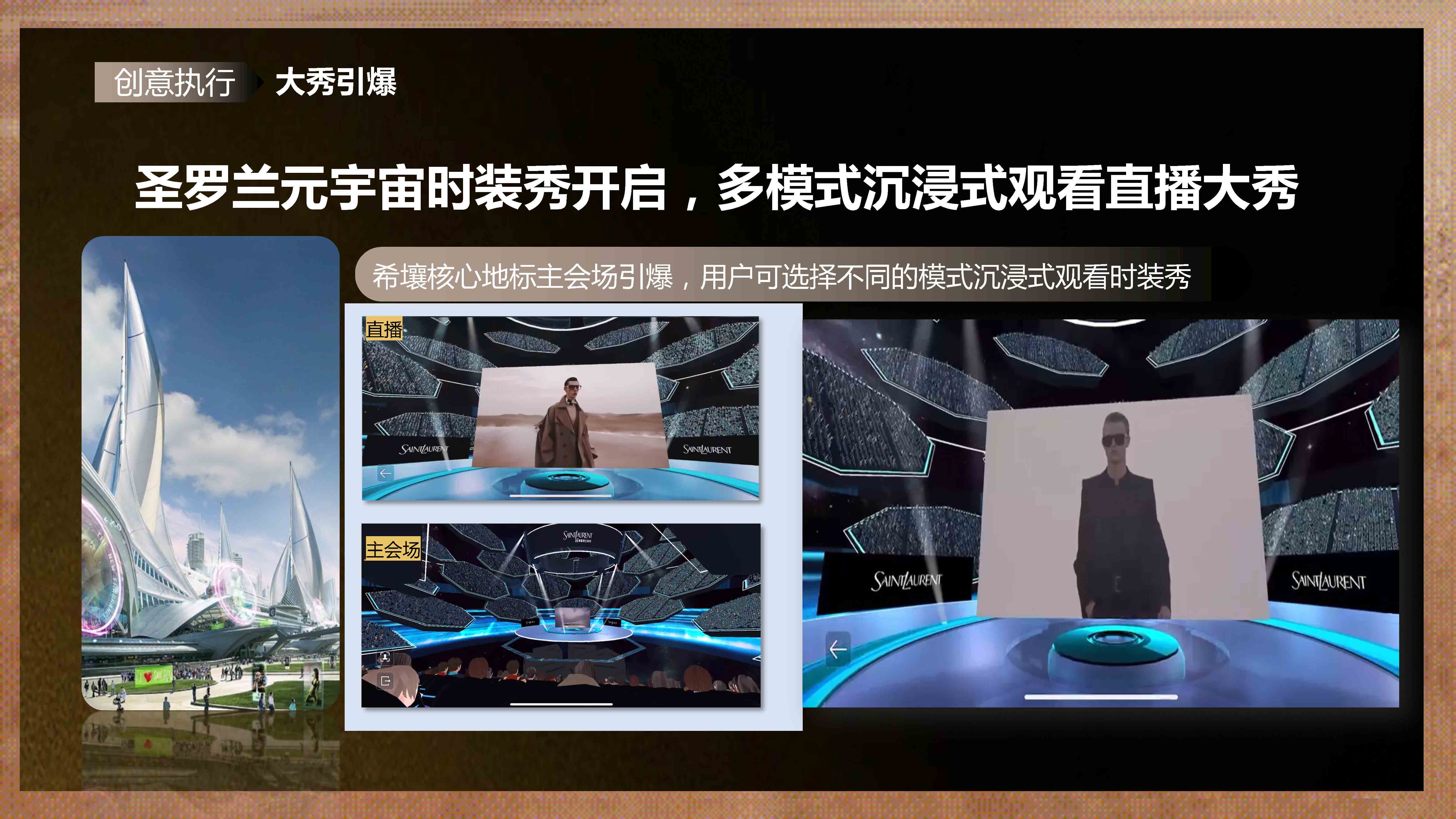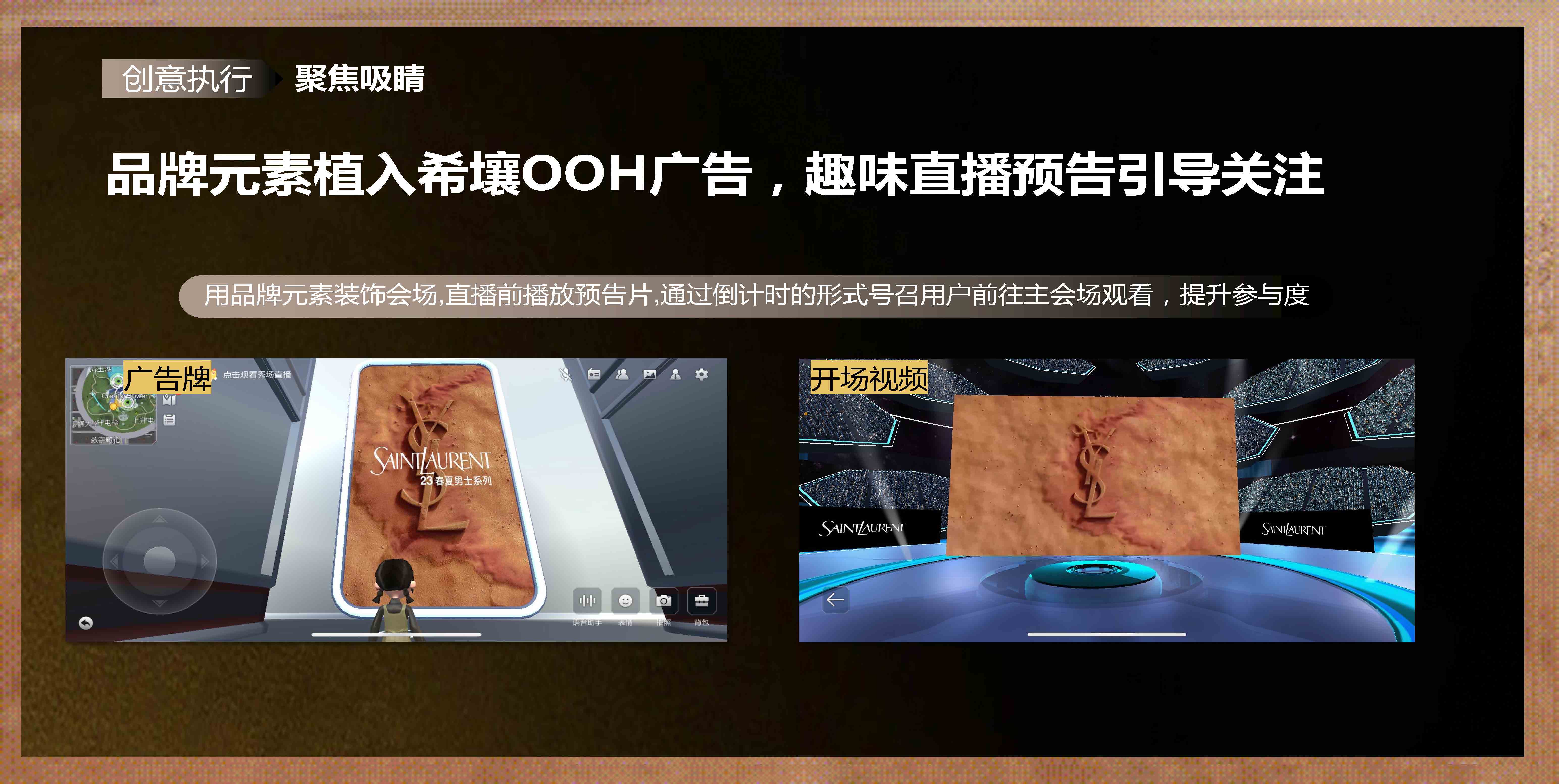 用户路径品牌元素植入,营造圣罗兰元时尚大秀氛围。品牌元素植入希壤OOH广告,趣味直播预告引导关注。