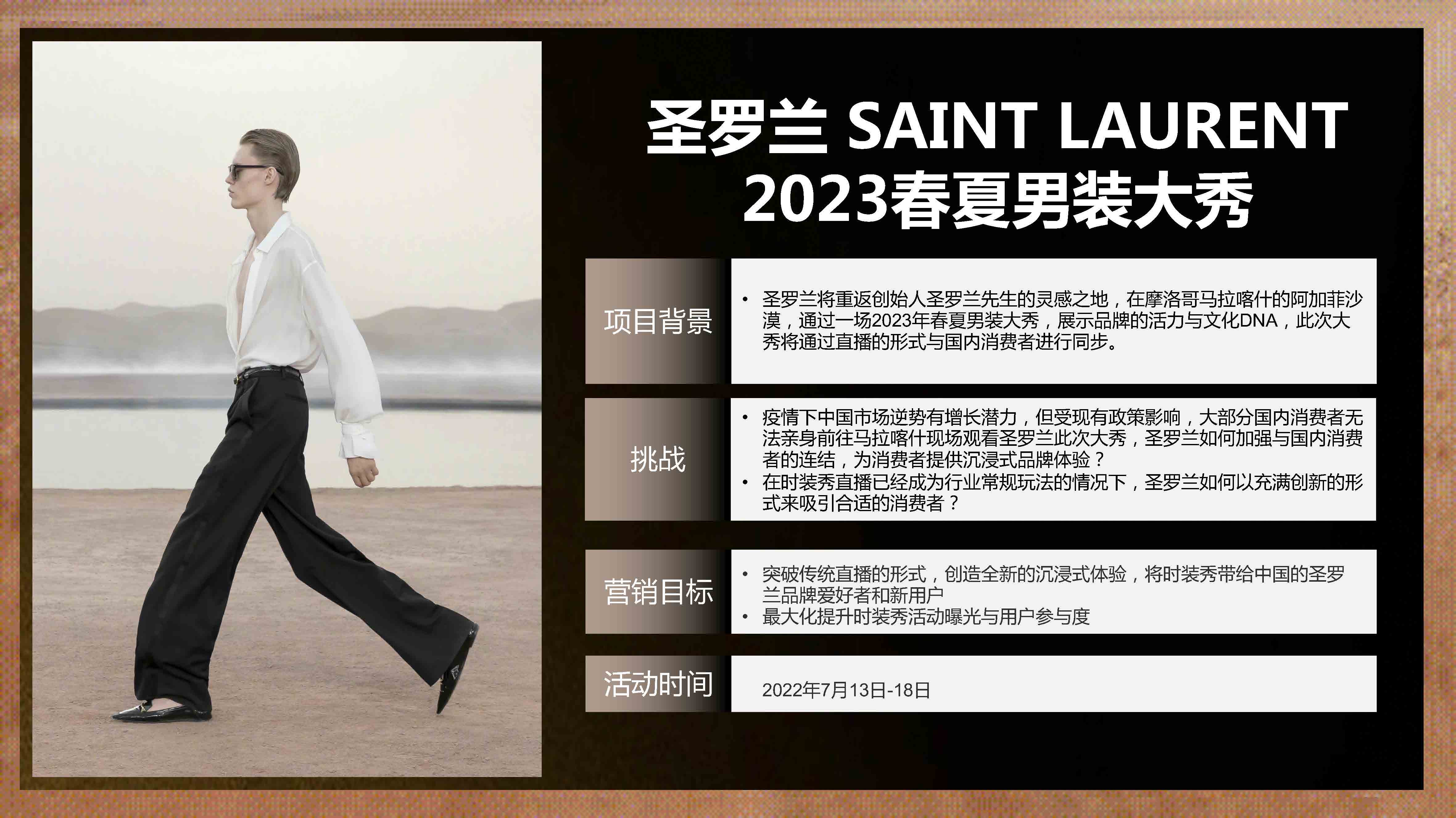 圣罗兰SAINT LAURENT2023春夏男装大秀,正值疫情之下,如何突破传统时尚直播发布会,让用户感受到不一样的大秀同时提高关注度,成为核心挑战。