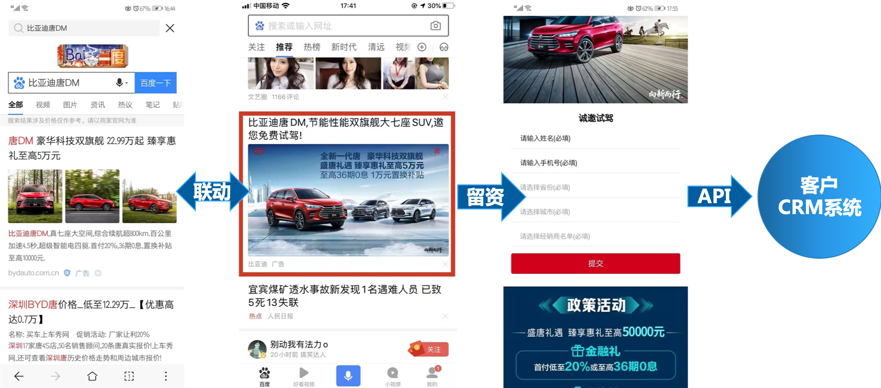 将搜索oCPC、信息流oCPC联动起来,通过关键词精准投放,触达用户群体A,以信息流投放触达用户B。同时,使用基木鱼落地页,通过前置表单缩短用户留资决策,再根据API接口,为比亚迪定制化开发CRM系统。