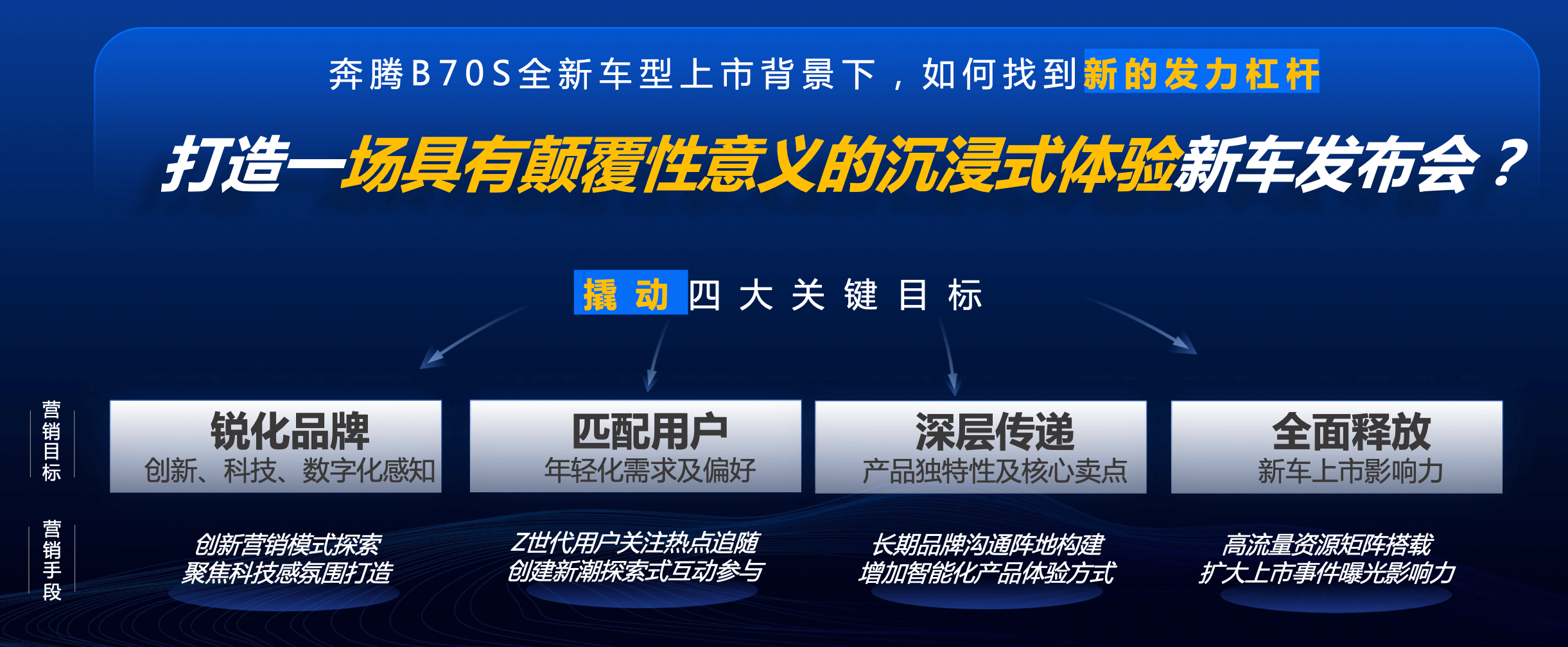 奔腾B70S全新新车发布模式思考,聚焦传播广度、沟通深度、创新互动、年轻群体影响四大关键性传播目标。