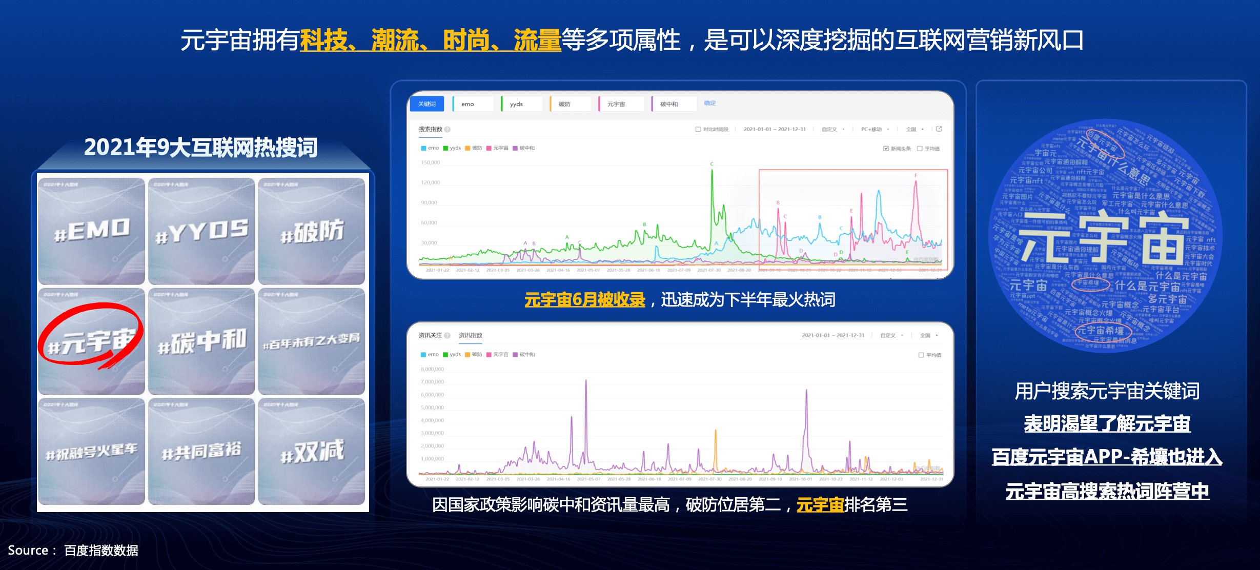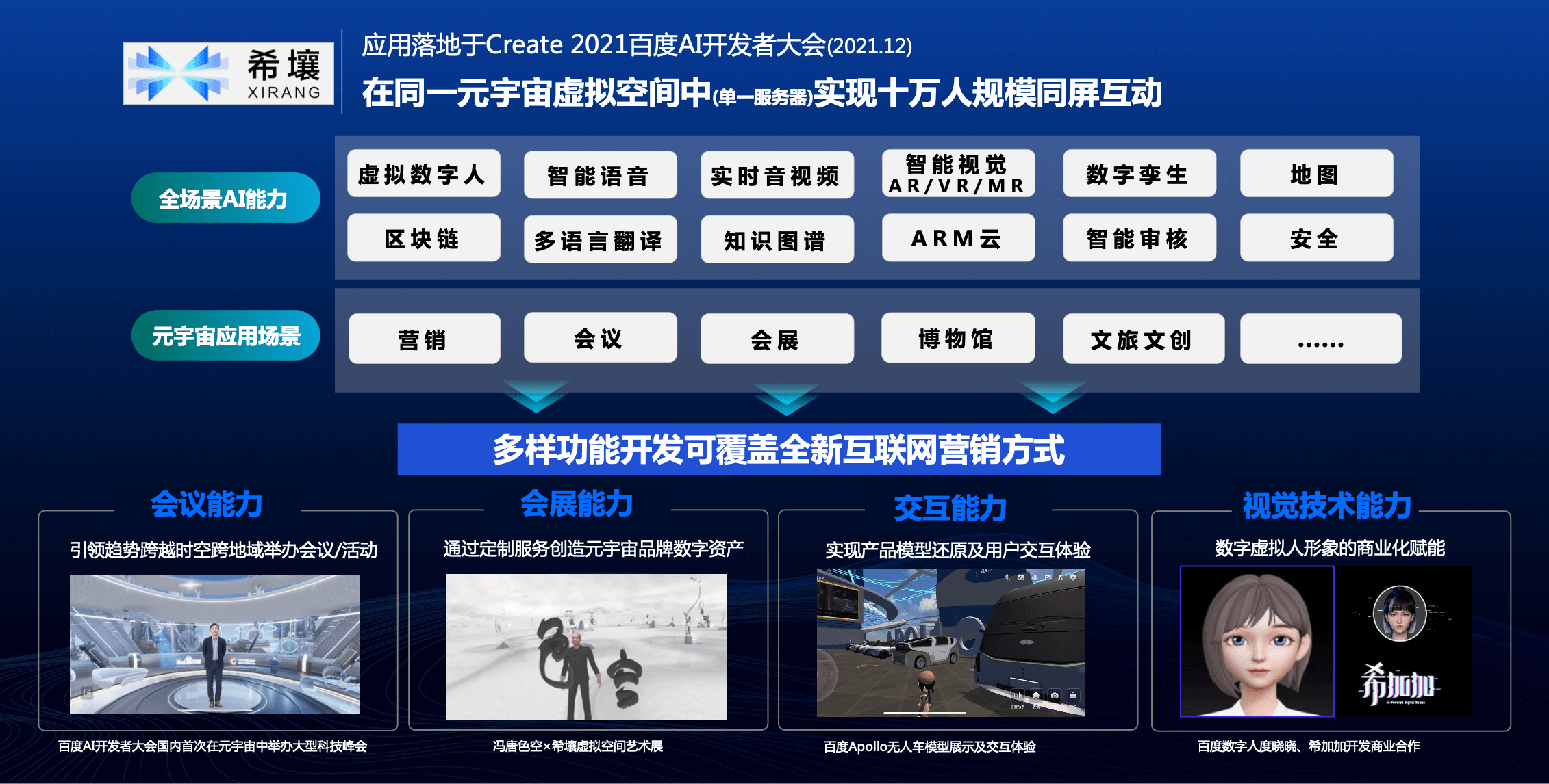2、元宇宙同时拥有科技、潮流、时尚、流量等多项属性,是可以深度挖掘的互联网营销新风口,在这一营销风口下,百度率先下场抢占“元宇宙”概念先机,落地了国内首个元宇宙平台——百度希壤。基于百度大脑在智能视觉、智能语音、自然语义理解、知识图谱的领先能力和百度智能云的强大算力,希壤旨在为行业提供云智一体的元宇宙基础设施平台,助力各行各业开拓“元宇宙”多个应用场景,探索数智化营销新模式。