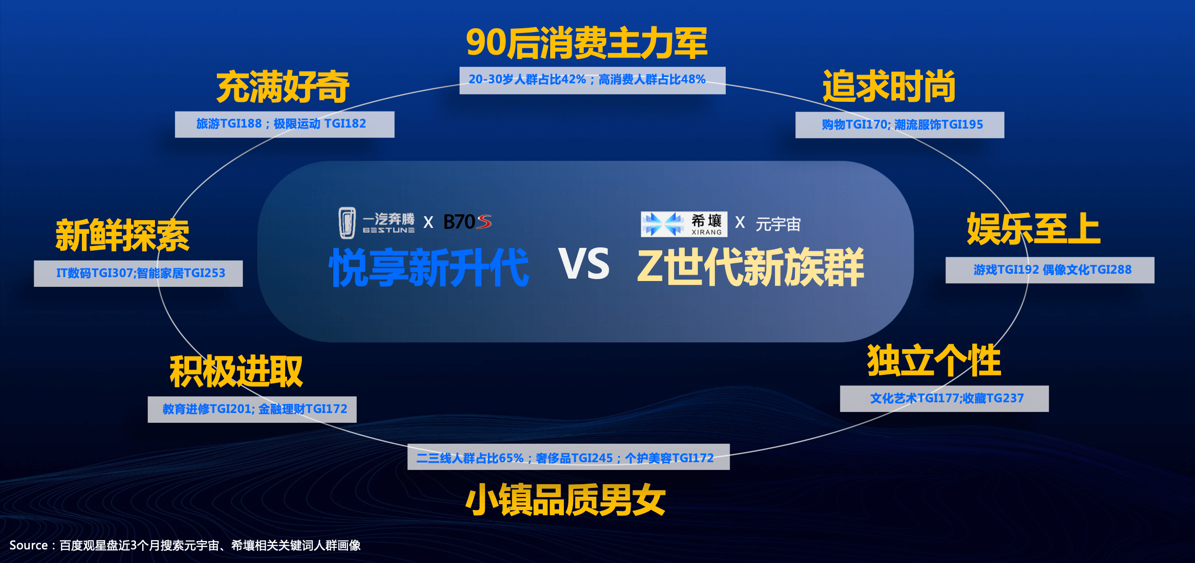 3、在关注“元宇宙”的用户群体中,通过用户画像分析发现他们是一群乐于探索、积极向上、追逐潮流、具备独立个性的Z世代新族群,90后消费主力军为主,二三线人群占比超65%。与奔腾B70S新车目标用户群体-悦享新升代人群高度重合。