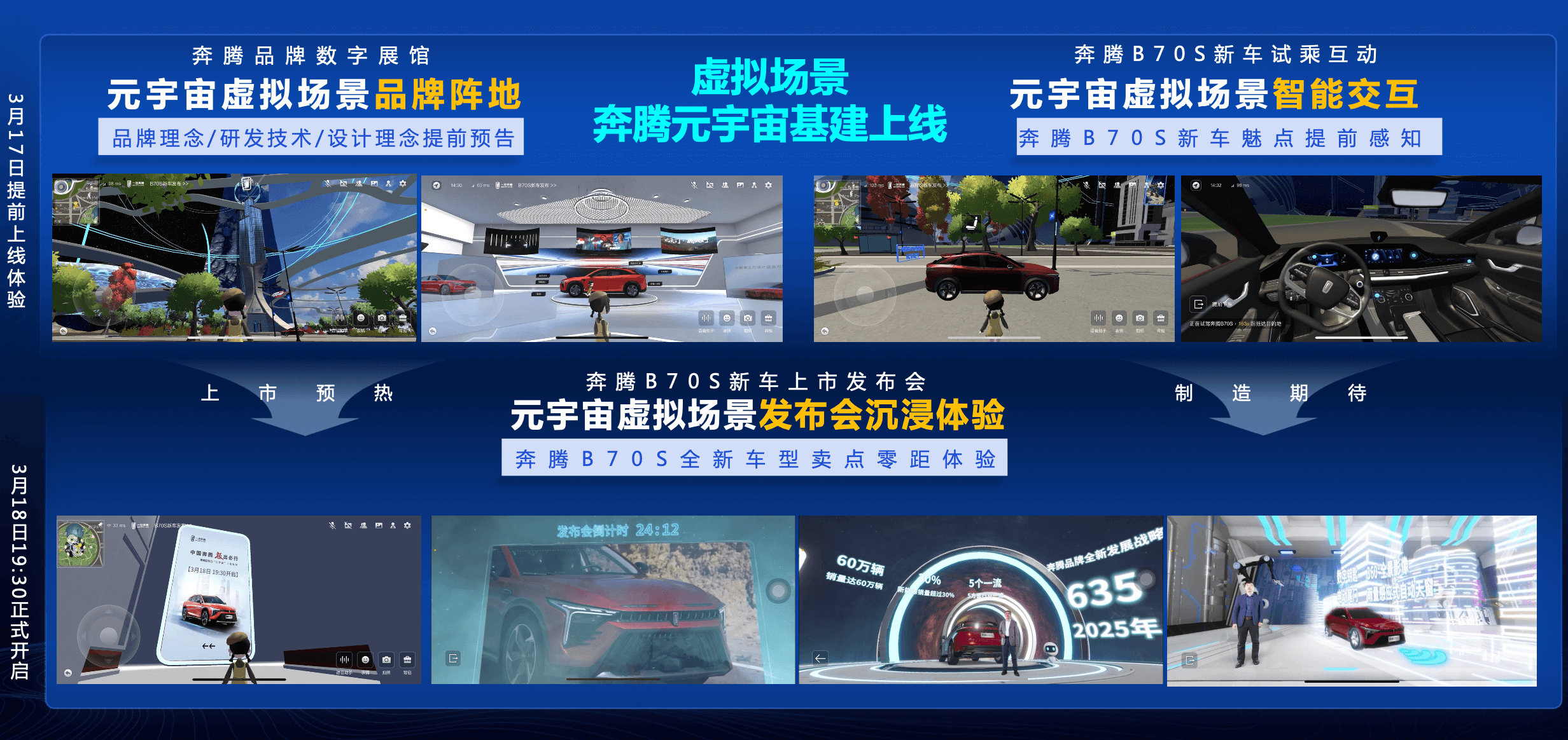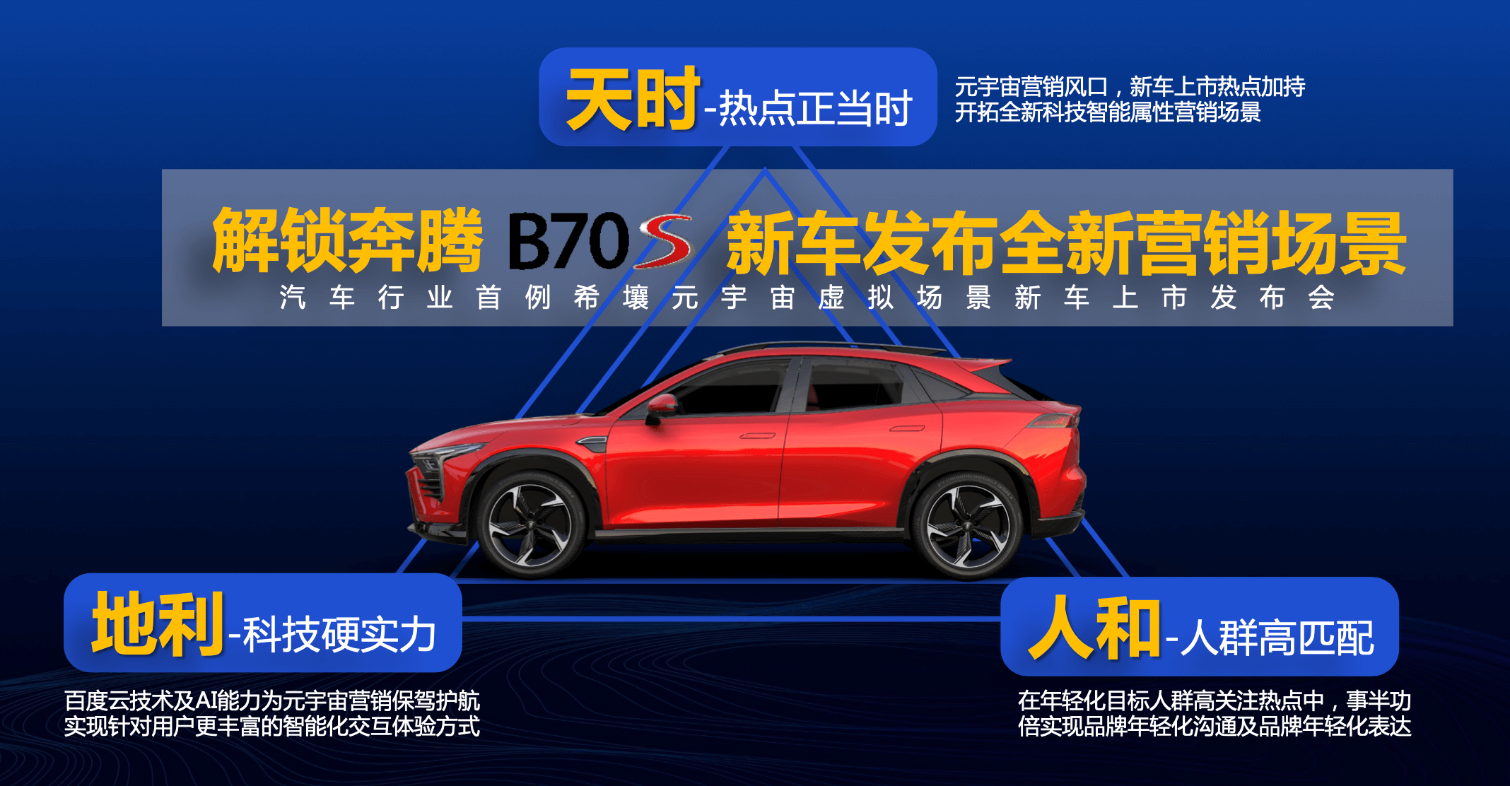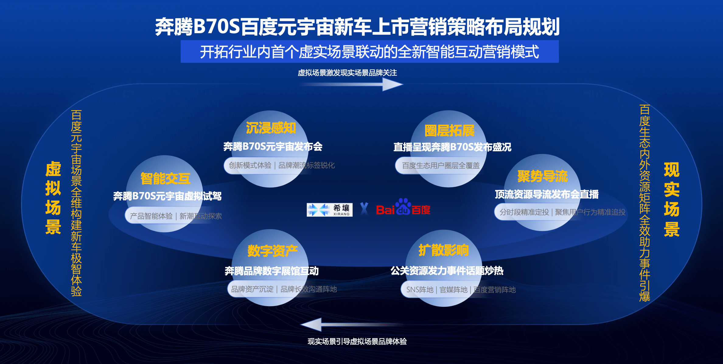 奔腾B70S百度元宇宙新车上市营销策略布局规划:开拓行业内首个虚实场景联动的全新智能互动营销模式,虚拟场景激发现实场景品牌关注,现实场景引导虚拟场景品牌体验。
