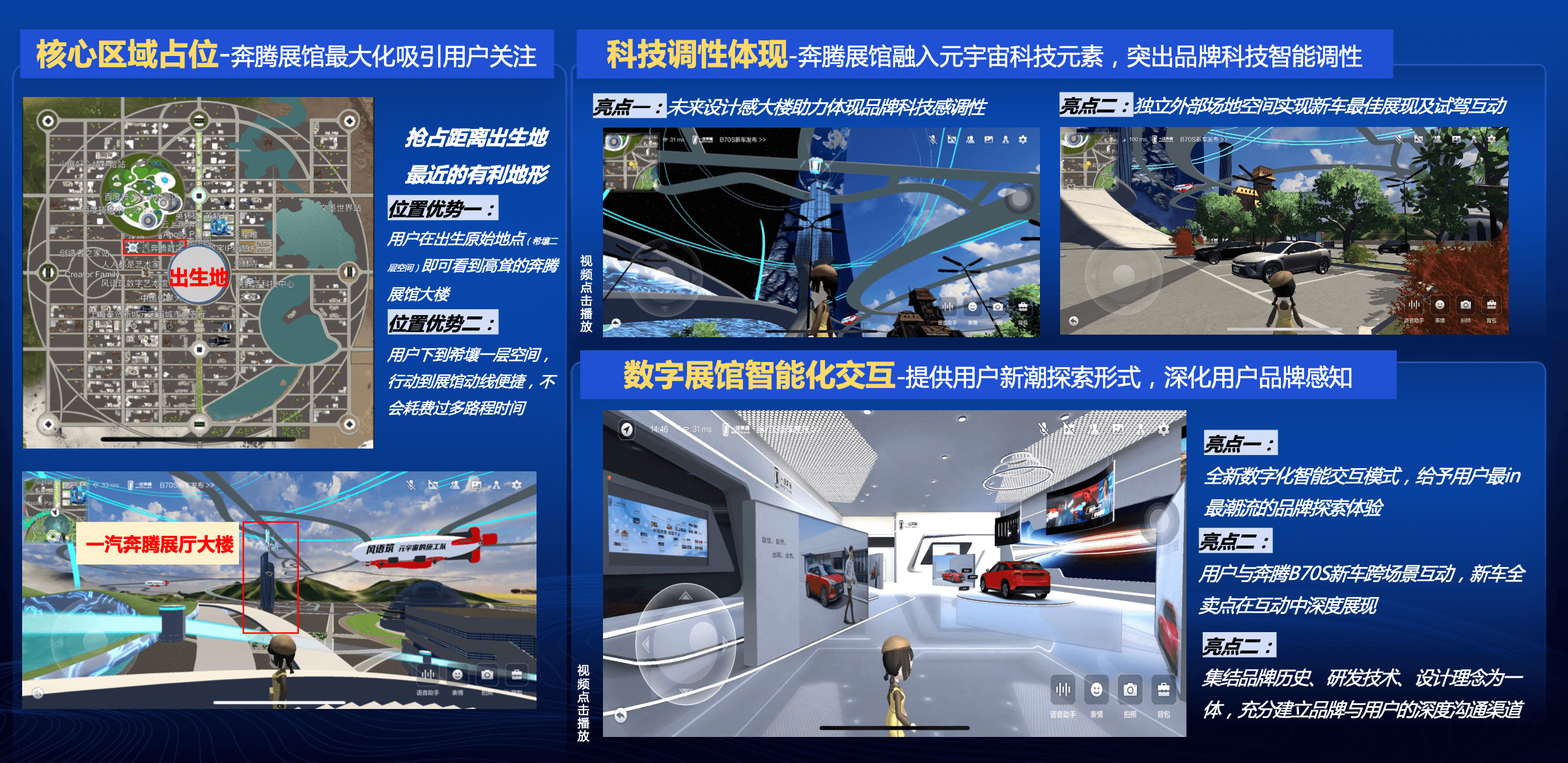 4、围绕元宇宙营销,一汽奔腾此次上市发布会正处在这样一个营销正当时、技术强背书、人群高匹配的背景下,借助元宇宙营销热点为新车上市从关注度、话题度层面进行流量加持,并为新车发布开拓全新科技智能属性营销场景,从而进一步深化品牌在数字感、科技感、未来感的全新调性。同时借助 “元宇宙”概念匹配用户年轻化需求及偏好,拉进品牌与年轻群体距离,带动年轻圈层用户对于品牌的认知及好感度。在百度云技术及AI能力的保驾护航下,一汽奔腾此次迈向元宇宙的这一步,势在必行!